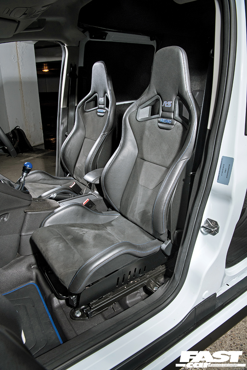 Jo smiles, “Since the van thought it was an RS, I decided to go all-in and turn it into the world’s first Transit Connect RS. With the Mk3 RS leather Recaros, steering wheel, cluster and boost pod, it’s now complete.”