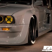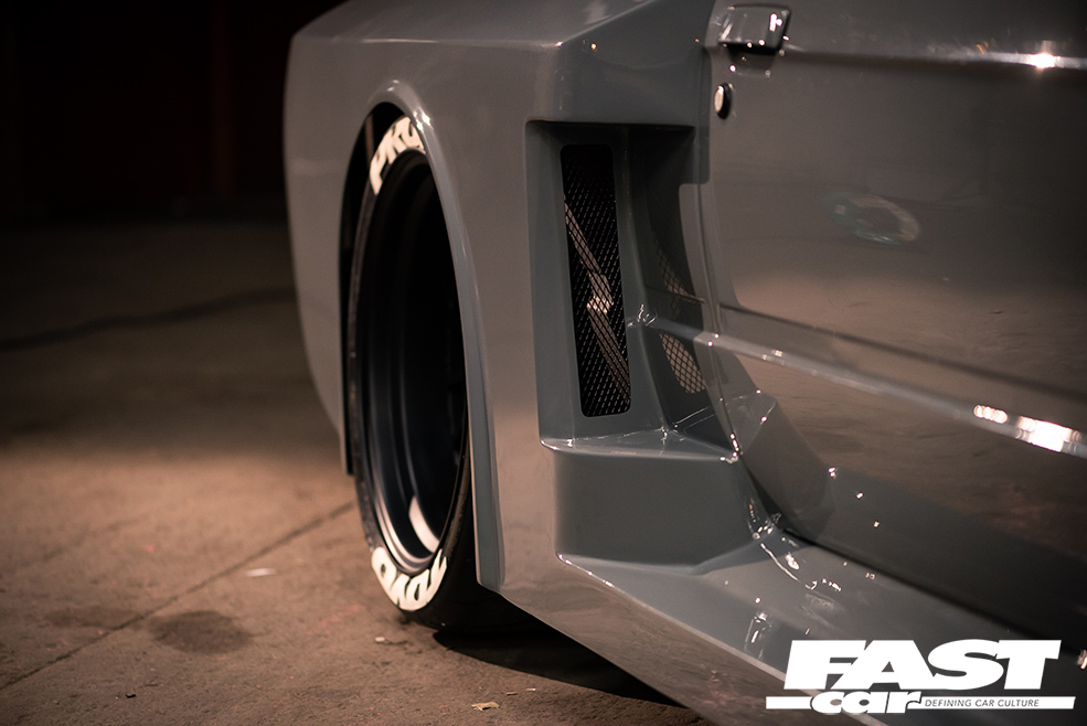 Custom one-off bodykit by Fat Fender, custom mid-grey paint, engine bay painted pastel mint, OE fuel tank deleted (replaced by fuel cell in boot) and spare wheel well welded up, sunroof welded, custom inner headlights with LED angel-eyes and functional air ducts, satin black dechrome, windows tinted by Dave at Zonkey Wrap