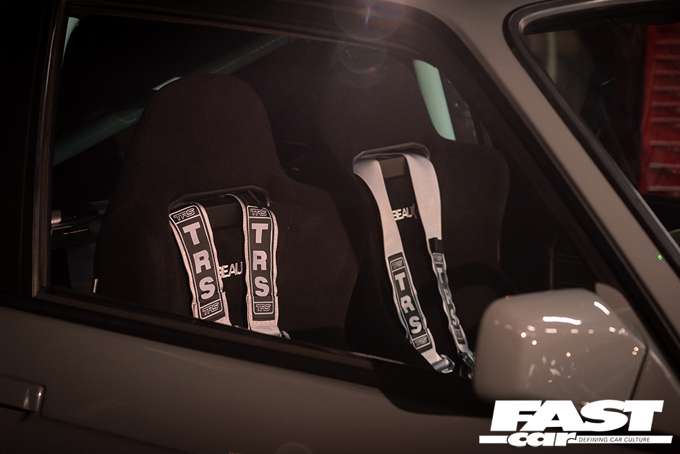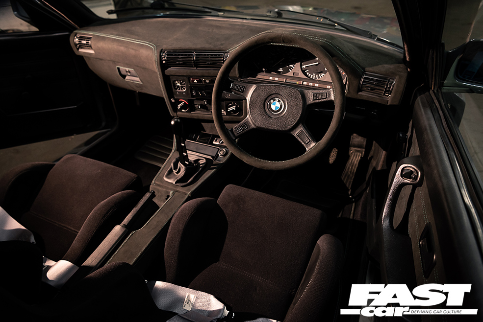 Stock dash and console restored and trimmed in anthracite grey Alcantara with mint contrast stitch, doorcards dyed black with Alcantara inserts to match, custom carpets, steering wheel retrimmed, custom headlining, OE E30 dials, rear seats removed, pastel mint painted rear roll bar, custom-stitched Corbeau RS2 front recliners, grey TRS harnesses, Pioneer SPH-10BT smartphone receiver headunit, TS-A speakers, slimline Pioneer Class D active subwoofer