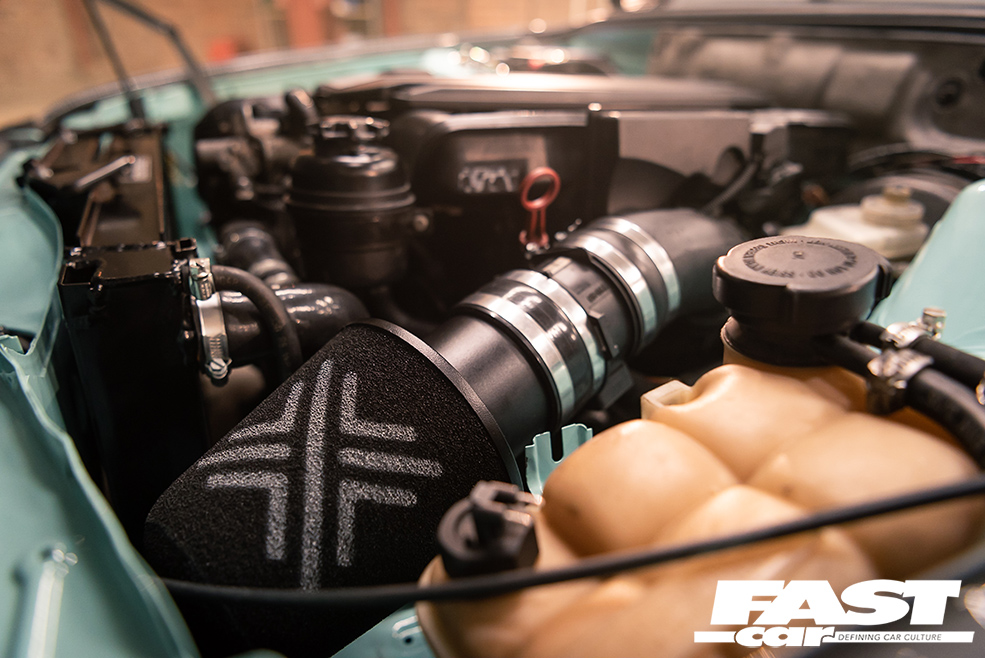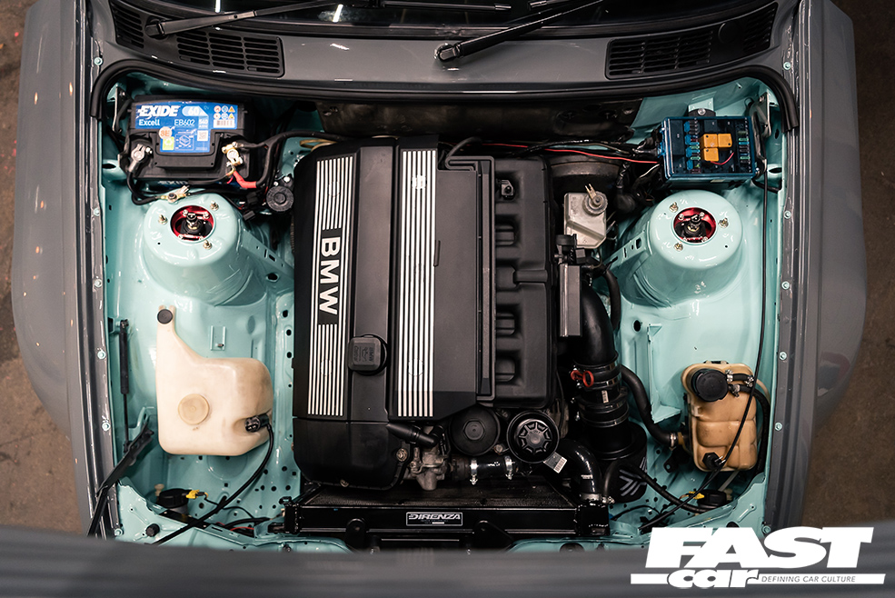 M54B30 3.0-litre straight-six (from E46 330ci), Pipercross air filter, E46 M3 Direnza radiator from Japspeed, Porsche 944 servo and master cylinder, custom-modded exhaust system, E46 M3 transmission with short-shift