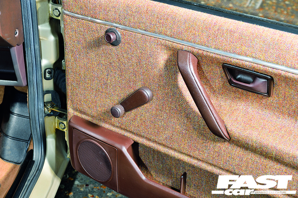 Those front seats are genuine Recaro N-Joy Fishnets. Retrimmed in Kinloch Anderson tweed, with biscuit square centres, they look like they could’ve been fitted as a factory option back in the 80s. Norman at East County Customs was the man trusted to do the work, and has done an incredible job. The rear bench, headlining, sunroof lining, sun visors and door cards have all been trimmed to match, and it genuinely looks and feels like a factory job.