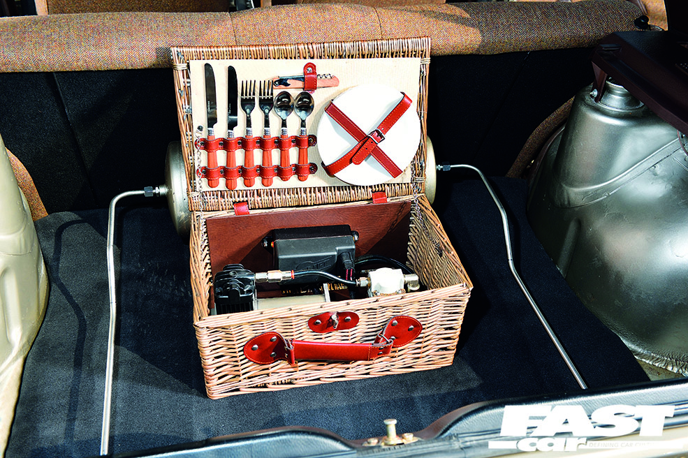 The car was sent off to air maestros, Only Charged Dubs (OCD), for its transformation to take place. BC BR dampers with OCD’s own bags were agreed on, whilst the compressor and water trap were ingeniously hidden in a period correct picnic basket. The build really is a work of art, in keeping with the rest of the car. The attention to detail is exquisite. When he got the car back, Tom decided that the 16” OZ MSWs that the car came on didn’t quite tickle his pickle, so a set of super-rare 14” Tramonts were dutifully sourced. They needed a bit of love, but that could be done come the winter, right?