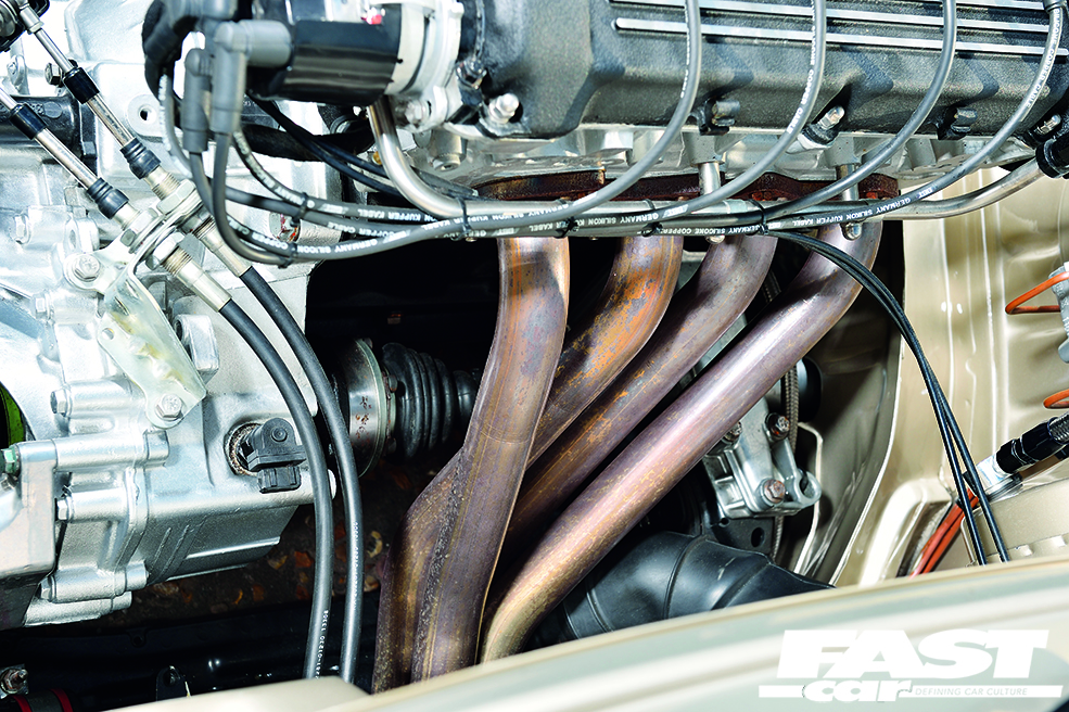 2.0-litre (ABF) 16v four-cylinder with 02A gearbox, G60 flywheel and VR6 clutch, inlet manifold and head ports matched, twin Delorto DHLA 45s, custom throttle linkage, chrome 45mm trumpets (no filters), TSR racing four-branch manifold with Demand Engineering stainless system (one silencer), Sytec fuel pressure regulator, Facet Red Series fuel pump, radiator and cam belt cover by Fresh Reflection, gearbox mount raised 25mm to make the engine sit level in the bay