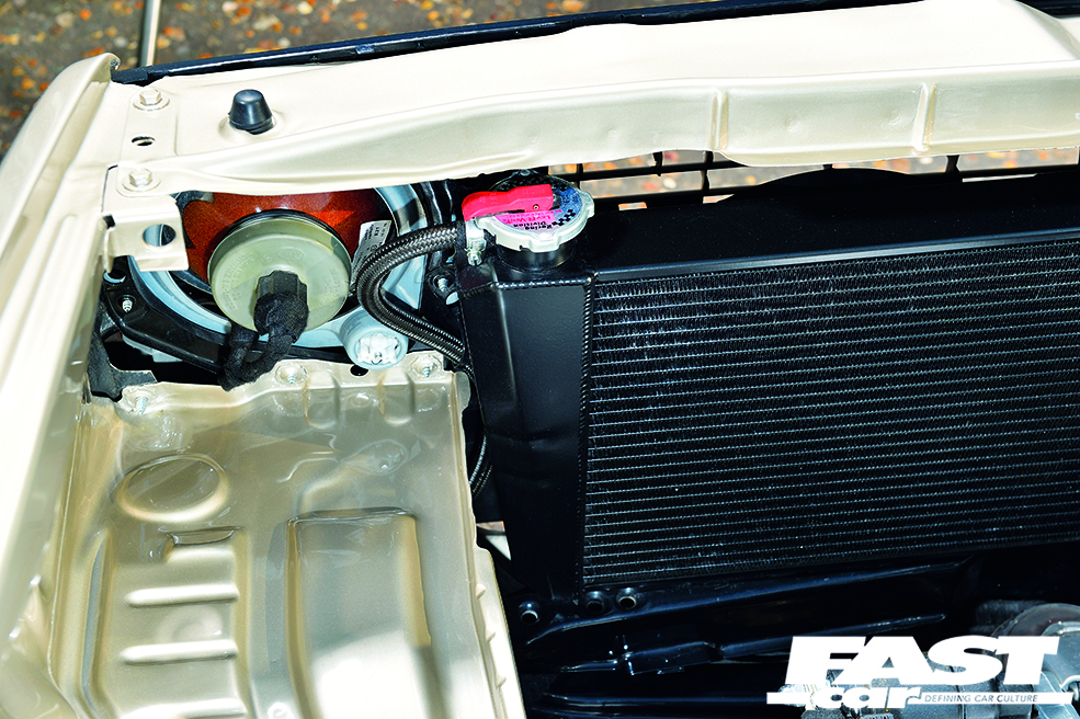 Well, looking at the pictures, you can see just how much work has gone into getting that bay looking like it does. Tom and friends Nathan spent hours removing the rain tray, and it’s so well done it looks like it could’ve come from the factory like that, which is the true mark of something being done right! “That’s one of the biggest jobs we did, and I couldn’t have done it without Nathan’s help. It’s a lot harder than it looks,” said Tom. They also spent many cold nights removing the battery tray, along with all the seam sealer, and welding up the loom holes in the firewall. It’s the little things that make all the difference.