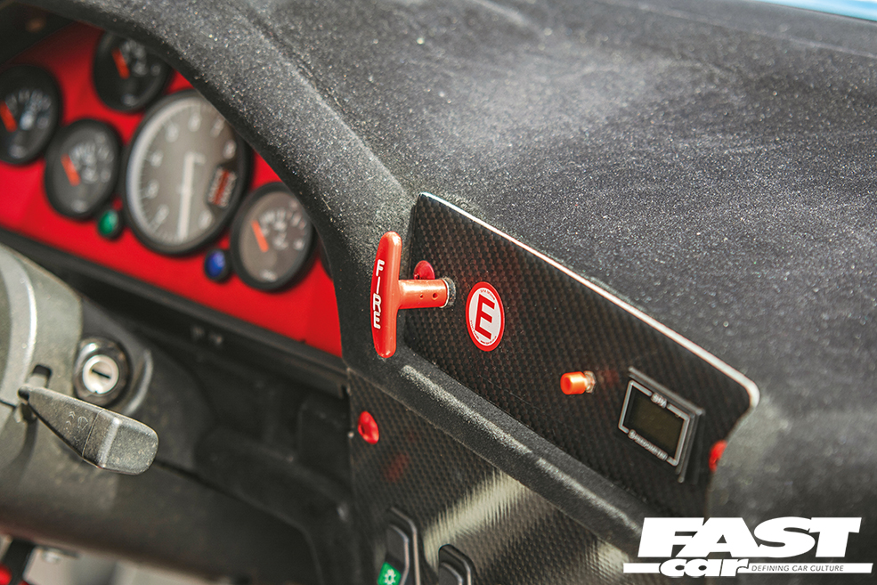 The interior follows function over form but still manages to look extremely sexy by virtue of being filled with nothing but the best motorsport components and finished to an extremely high standard. There’s a Ramsport heated front screen, a flocked dash incorporating a Group A instrument panel with corresponding 8000rpm tacho, gauges for the engine, gearbox and differential oil temperature, engine water temperature and engine oil pressure along with a fuel gauge. There’s a Spa digital speedo, a Sparco Pro 2000 FIA-approved seat with a Sabelt six-point harness, an OMP Corsica 330mm suede steering wheel, and a Longacre wide-angle rear-view mirror. Meanwhile, an FIA-approved foam-filled fuel cell is mounted in the spare wheel well and connected to a rear-mounted aero filler cap with a fast-fill alloy tube and there’s also a Facet competition fuel pump from Merlin Motorsport. It’s exactly as hardcore as you’d expect, but it’s been executed with absolute attention to detail.