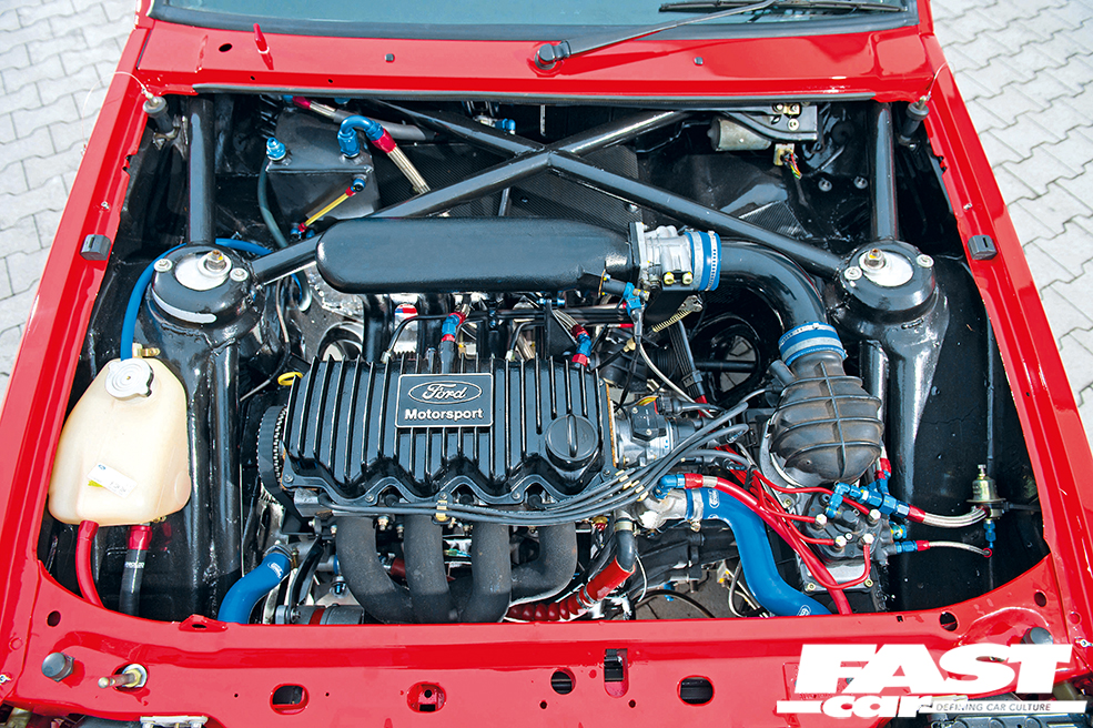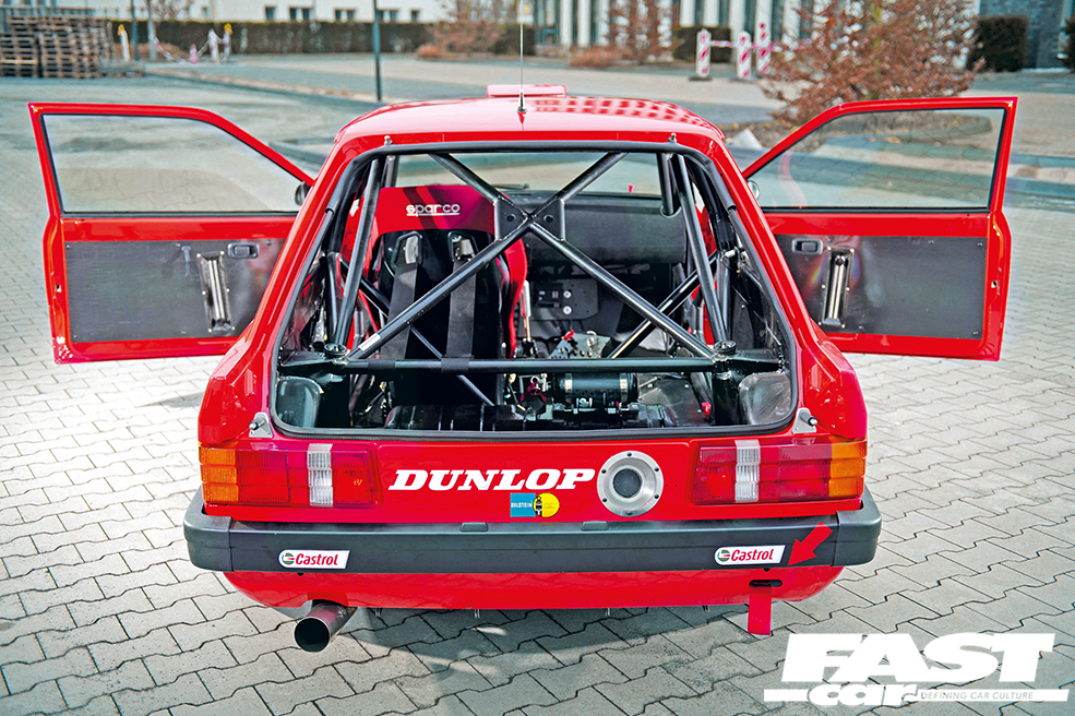 At the heart of the car lurks a Group A-spec 1600 CVH built by Neil Brown Engineering – a real screamer of an engine that pushes out an easy 165bhp thanks to a modified head, aggressive cam, enlarged throttle body and suitably beefed-up fuel system. The grunt is routed through a highly developed version of the standard B5 five-speed; one that’s had a sophisticated aftermarket LSD fitted, along with close ratios and toughened, bolted-in driveshafts. All was carefully taken apart and checked over by Guido before being put back together and slotted into position, and the whole engine and transmission assembly has proved remarkably reliable ever since.