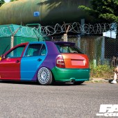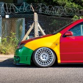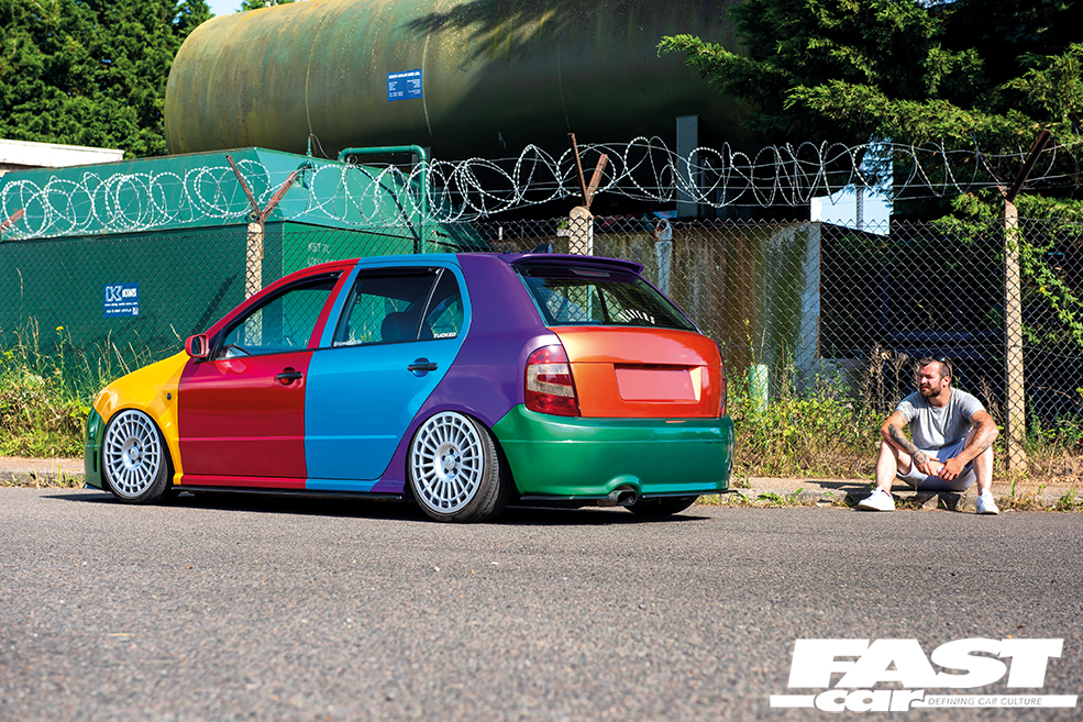 Wheels maketh the car, as has long been established in this parish, so the first move was to acquire a fresh set of Fifteen52 rims for the Harlequin Skoda Fabia vRS, plus some 10mm spacers for the front in order to neatly fill out those chunky little arches. An air-ride kit was then bought from Offset AutoHaus, along with fittings from those good people over at Only Charged Dubs. And with the haul of loot turning into a substantial pile, Joseph had to formulate a plan of action. Without further ado, he packed a suitcase and hightailed it over to his mate Daniel Kenny’s house, where the fellas set aside a full two weeks to give the Fabia a proper makeover. Everything was stripped down and the air-ride installed, side-stepping a few hurdles with air lines being too close to the exhaust and entry points brushing wheels, and before long it was all safely located and working correctly. With that taken care of, the two guys along with Daniel’s dad set about sprucing up the bodywork ready for wrapping, which required endless amounts of filling, sanding and repeating, until finally the Skoda was prepped for its disco facelift.