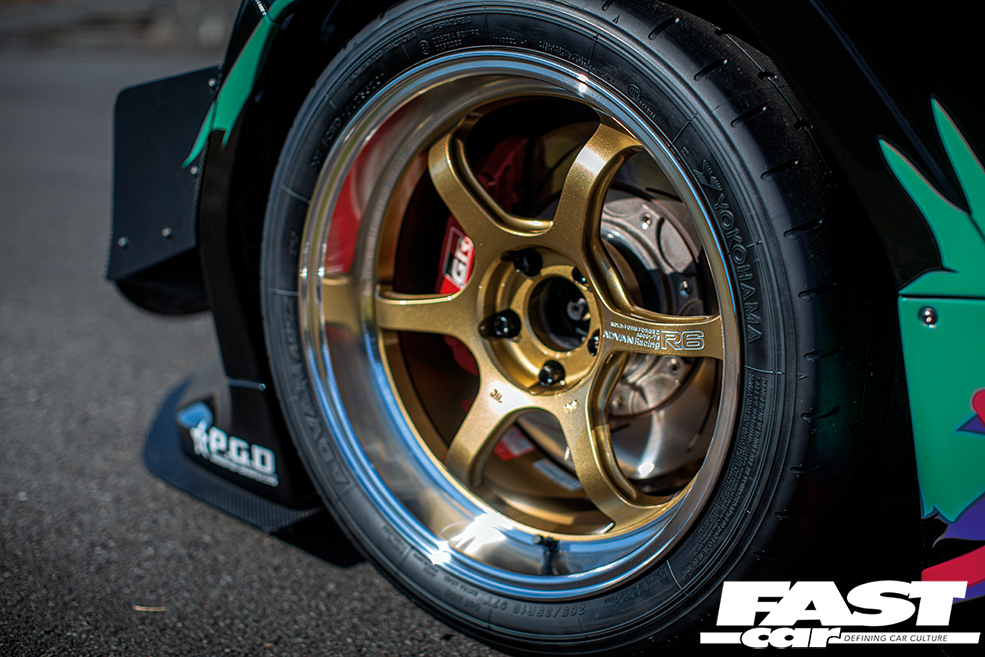 To fill its beefed-up arches, the HKS GR Yaris runs what we used to refer to back in the day as ‘GT-R size’ wheels and tyres. That’s a set of 9.5x18in wheels – in this case Yokohama Advan Racing R6s – shod in Yokohama Advan A052 high-grip radials. It’s pretty crazy to think about a Yaris running such a large combo, but they definitely don’t look too big for the car.
