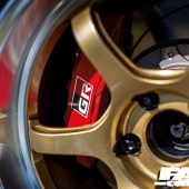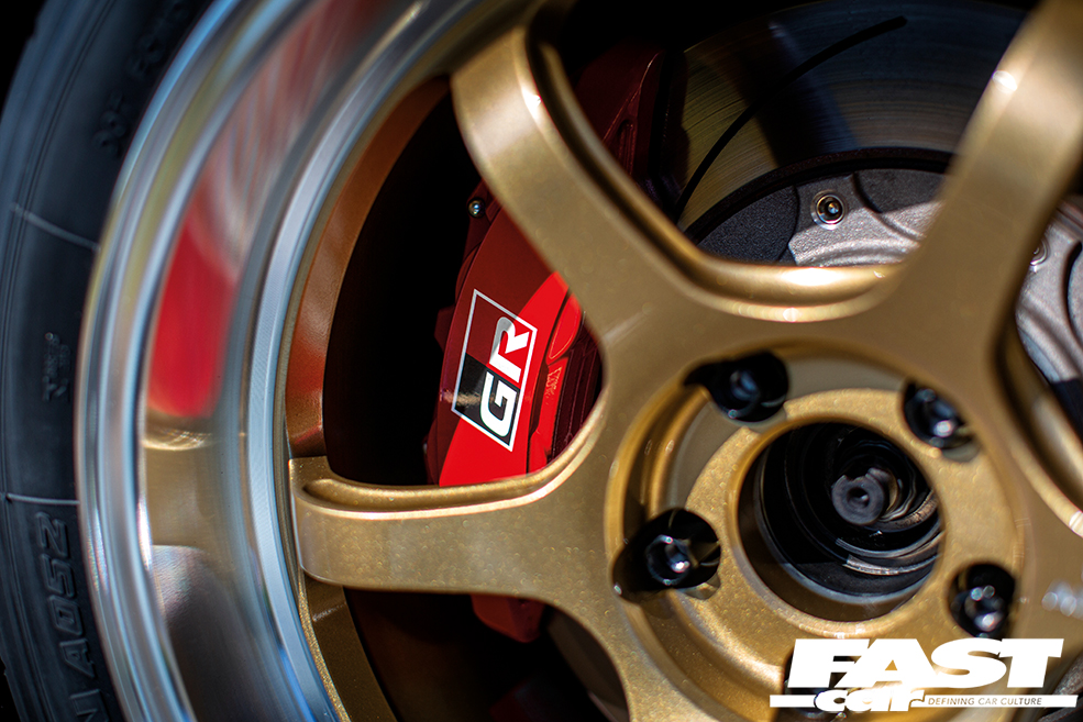 This car runs the red GR brake kit, which comes on the RZ model from the factory when it’s fitted with the optional ‘High Performance’ package (which also adds cool things like the front and rear Torsen diffs and an intercooler water sprayer). The beefy four-pot front and two-pot rear monoblock calipers are yet another reminder of the extent Gazoo Racing has gone with this car. This is a far better and much higher-spec braking system than the GR Supra gets from the production line; and that’s something to think about…