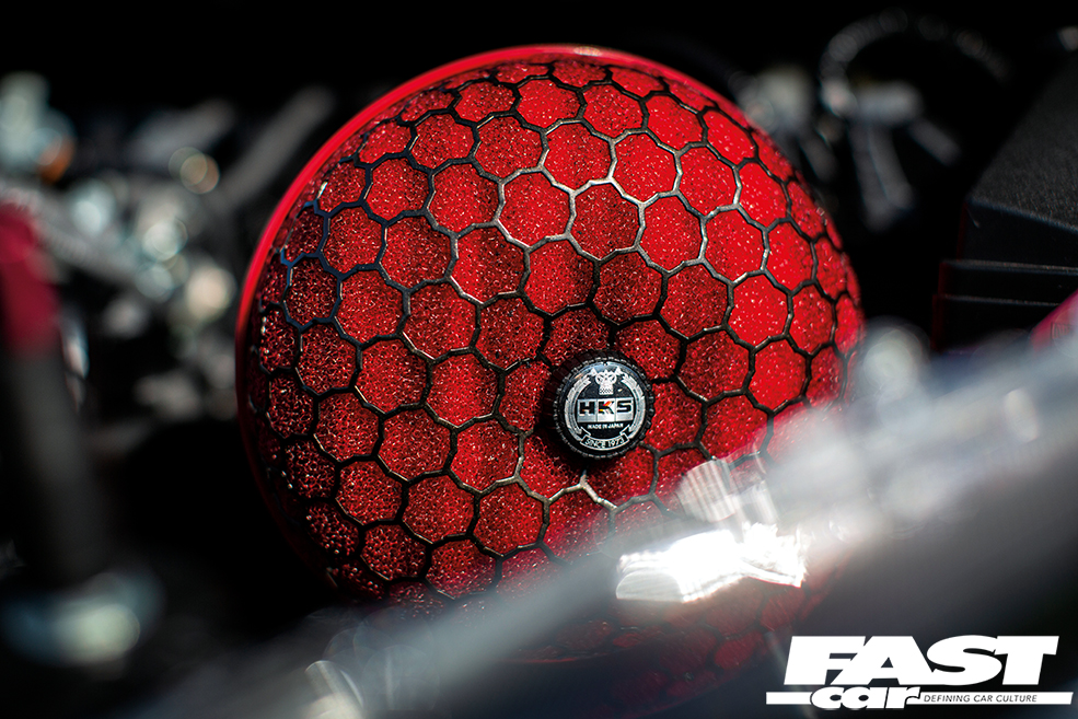 The aggressive stance is further highlighted by the iconic HKS oil-slick graphics, which are an instant visual cue to those in the know that this is a car built to perform.