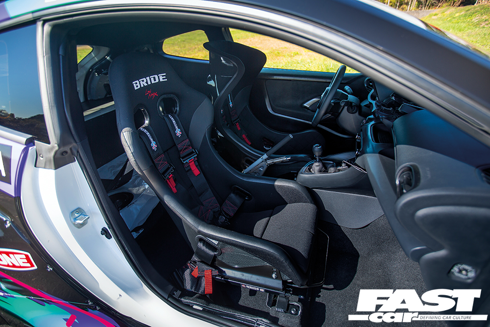 Pre-production interior, Bride Zero bucket seats and TeamTech harnesses, stripped rear seats, fly-off handbrake modification, MoTeC C125 colour display/data logger