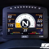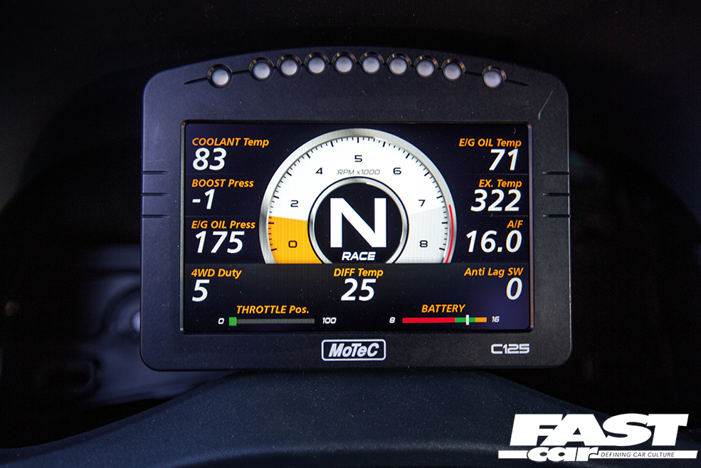 Surprisingly enough, the stock steering wheel has been retained, although this is soon to be swapped out for a race item, most likely one of Taniguchi’s signature Nardi wheels. The OEM dash, however, has seen the bin, having been replaced by a MoTeC C125 colour display/data logger to provide all of the real-time data you’d ever need from the ECU.