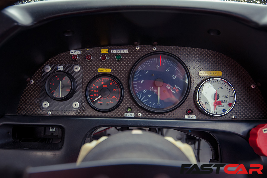 Personal steering wheel, bucket seats, rollcage, various gauges including boost pressure, oil pressure and oil temperature, custom dashboard insert with fuel and ignition cut-off switches, E-TS adjuster, inner door panels changed to non-GT-R model
