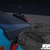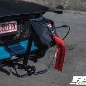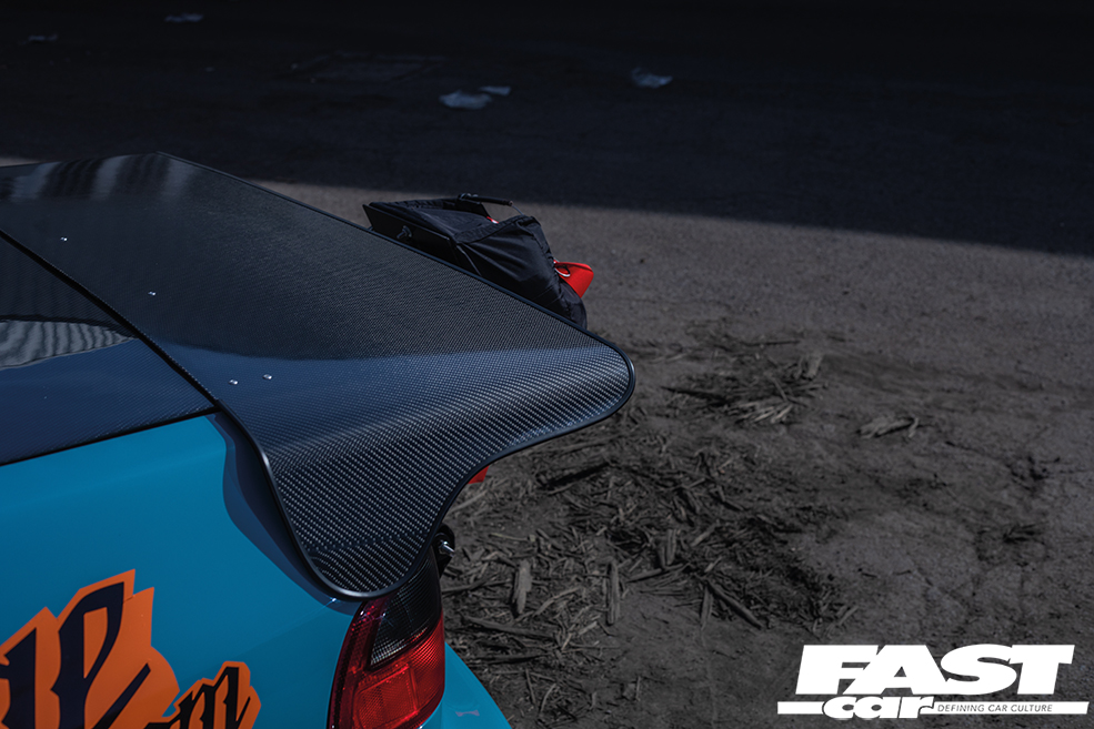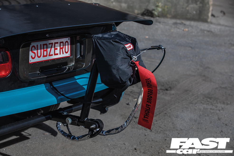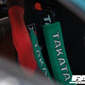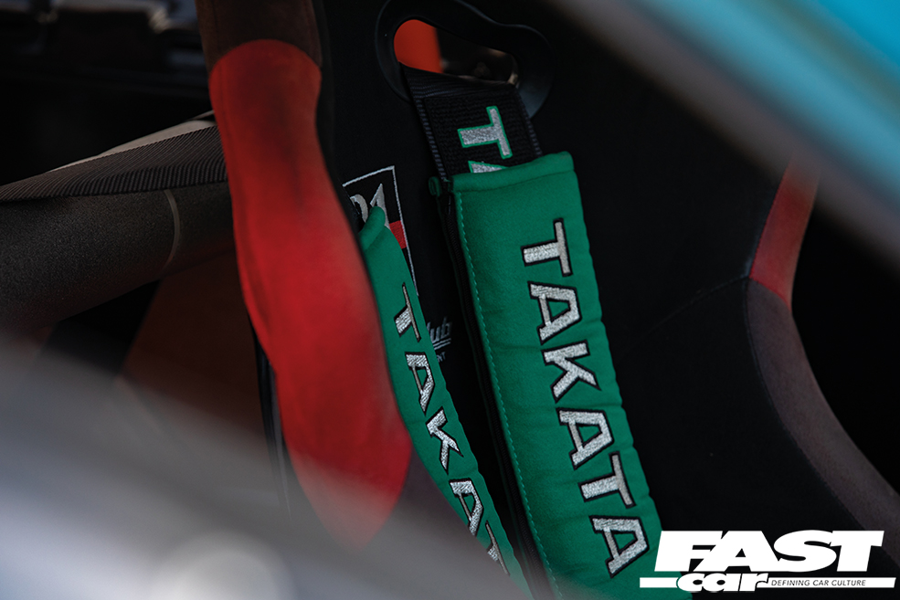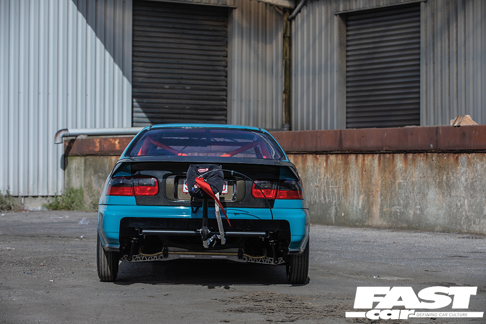 For starters, if you want to go drag racing, you need a bit of power. That’s a given. So Jimmy’s swapped in a B18C and thrown in a VTEC lockout along with a modded Skunk2 intake, massively uprated fueling (and we’re talking ridiculously big, including 2,000cc injectors!) and, most importantly of all, forced induction. That B-Series is now rocking a meaty BorgWarner turbo, featuring the bonnet-exit exhaust and screamer pipe from Sheepey Built that’s one of our favourite performance mods on the scene right now. And that’s about 700-odd horses right there. The next thing you really need is traction. There’s no point having the power to walk the walk if your cocky swagger then turns into a stumble. So you’ll note that the wheels are staggered back-to-front – this is a FWD drag car, after all – with 7.5×13-inch Lenso rims running full drag slicks up front, while the super-slim 3.5×15-inch rears wear low-drag skinnies. The bodywork has been comprehensively reworked to adjust to its new life punching holes in air as well; while the bulk of the shell has been beautifully repainted (by a Toyota garage, the sacrilege!), the front end is slippery and smooth as well as lightweight, thanks to a sleek new carbon fibre bumper from Ce Dois Racing in Portugal, which is joined by carbon wings and an Aerodynamics carbon bonnet. The latter firm also supplied the carbon bootlid, and it’s at the tail end that things start to look really serious. For one thing, the cutaway aero bumper gives you a coquettish glimpse at the beefed-up undercarriage, with its Skunk2 chassis upgrades and BC coilovers, but you also can’t really miss the super-long carbon drag spoiler, which exponentially lengthens the profile for optimal airflow. Most in-your-face of all, of course, is that massive Simpson Racing parachute. That’s a real statement of intent, that is. You don’t fit your car with a parachute unless you really need one.