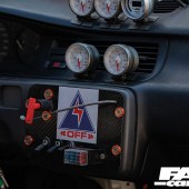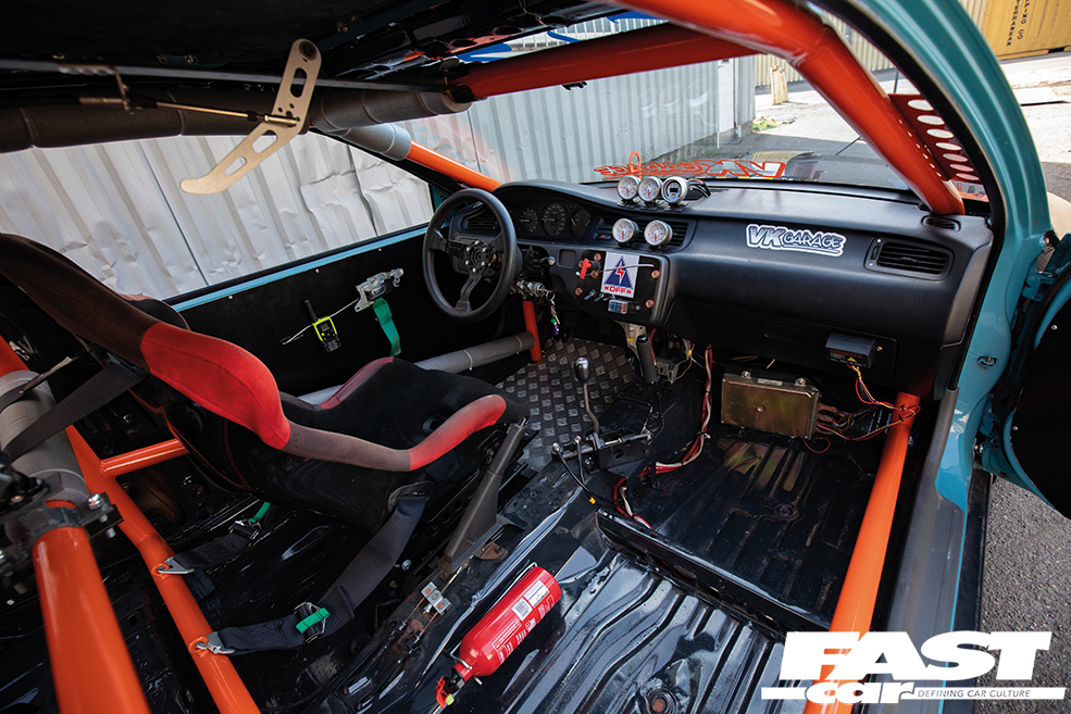 Stripped, full multi-point rollcage, Buddy Club P1 bucket seat, dash lightened and modified, STRI Racing oil pressure, oil temp and boost gauges, AEM fuel ratio meter, killswitch, Skunk2 short-shift, hydraulic handbrake, stripped doors with aluminium panels