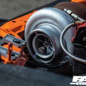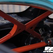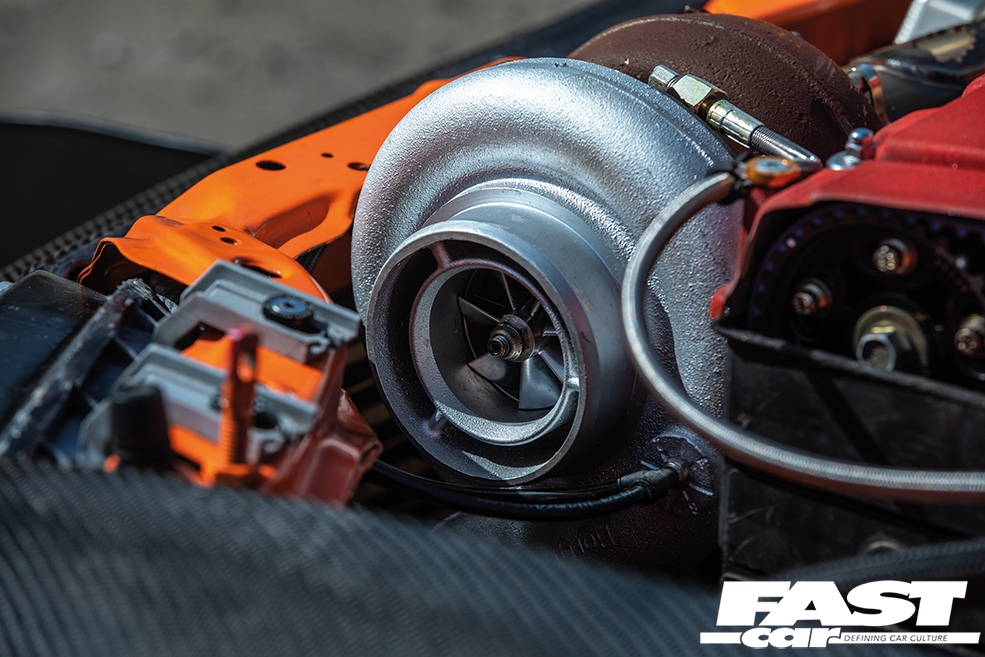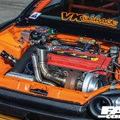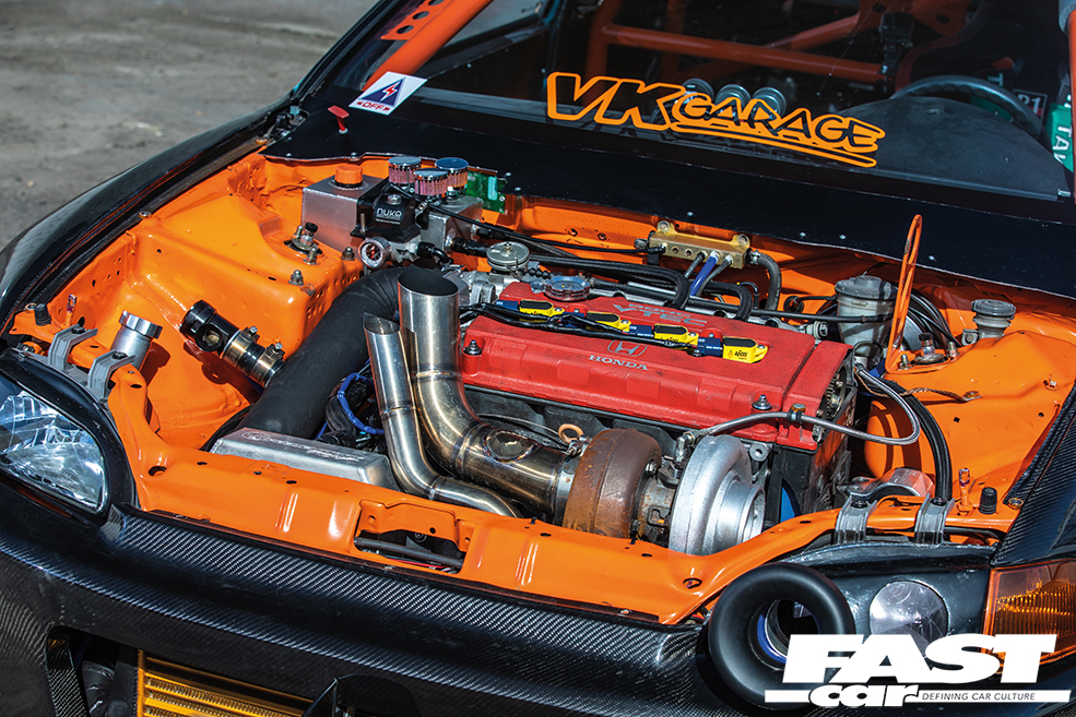 B18C 1.8-litre VTEC – rebuilt by Kaspakas Racing (The Netherlands), Speedfactory VTEC locking pins, Skunk2 UltraRace intake – modified by 4 Pistons Racing (USA), Injector Dynamics 2,000cc injectors, AEM fuel rail, Nuke Performance fuel pressure regulator, custom fuel tank, Mishimoto intercooler, Borg Warner 300SFW turbo, Precision wastegate, GFB dump valve, custom turbo pipework, Sheepey Built bonnet-exit exhaust and screamer pipe, Speedfactory drag radiator, Hondata management, AEM cam gears, ATI crankshaft damper, flywheel scatter shield, Competition Clutch twin-plate clutch and flywheel, Hasport engine mounts