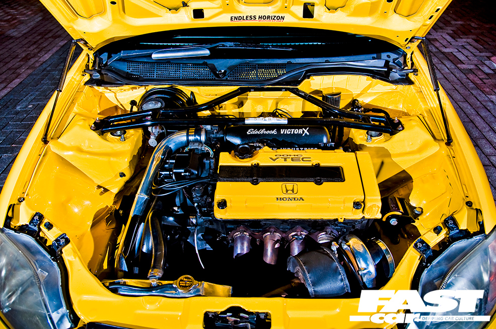 Stock B18c4 engine, Integra Type-R cams, custom Solid Fabrications top mount exhaust manifold, T60 Turbonetics turbo (turbo housing polished by Revolution blast polish paint), custom 2.5in-3in downpipe, custom straight through 3in exhaust system, custom intercooler piping polished by Revolution (blast polish paint), Spearco monster intercooler, Tial dump valve, Tial 38mm wastegate, custom screamer pipe, Edelbrock Victor X intake manifold, Benen Industries fuel rail, Precision 780cc injectors, K Tuned fuel set up consisting of inline fuel filter, fuel pressure regulator/ gauge and black braided hoses, Jazz catch can, Competition Clutch Stage 4, ACT lightened flywheel, Custom Innovative engine mounts, Endless Horizon Motorsport Braided clutch line, T1 Race developments turbo blanket, full wire tuck, power steering & air con delete, Hondata S300 ECU, 340bhp@8.4psi tuned by Daz at Endless Horizon Motorsport