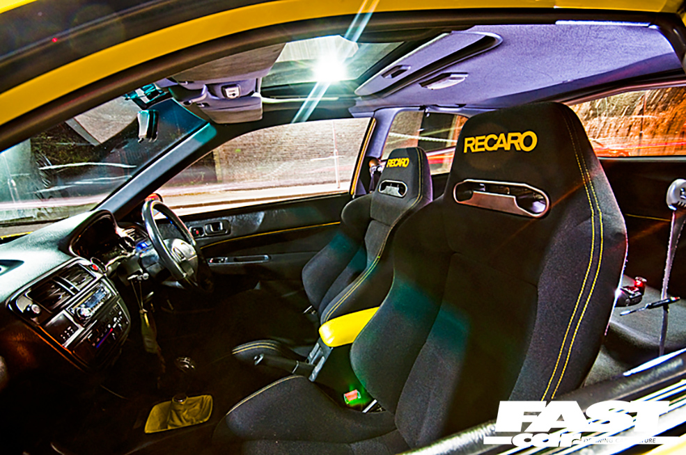 Recaro Speed seats, stripped rear, carbon gauge pod, AEM air/fuel gauge, AEM Tru boost controller