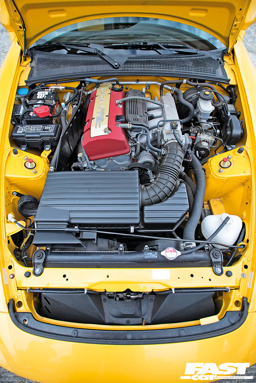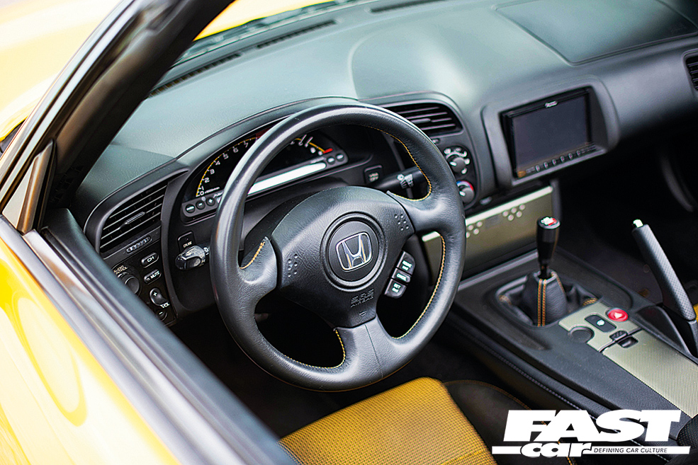 Inside, and Honda got the CR’s interior pretty much spot-on from the word go. Gone is the leather-clad cocoon we’re used to with standard S2Ks, with heavy-duty cloth bucket seats in their place, and no radio or air-con as standard. Sara has capitalised on this focused feel with a beautifully no-nonsense Spoon gear knob, along with a JDM sat-nav setup. With no soft-top, the CR relies on a removable hard-top when the weather gets a bit dodgy. This has allowed the car to incorporate Ferrari-esque humps behind each seat, which look insanely cool when cruising with the roof off. Sara admits to being caught out without the roof on occasion, though: “I’ve learned not to go anywhere near the car if there’s any chance of rain – not only is it a complete handful, if you’ve gone roofless, you’re screwed!” she explains.