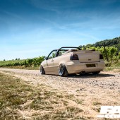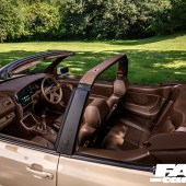 2.0-litre 16v ABF, twin Weber 45 carbs with Pipercross filters, manifold-back exhaust system with single rear silencer and twin upswept tips, custom expansion tank, battery relocated under rear seat and swapped for 2x race batteries, ABS delete (replaced with bias valves), top mount covers retrimmed, heater matrix inlet trim cover, gas strut trimmed, scuttle panel wiper clearance smoothed and trimmed, custom Pipercross cabin filter, engine bay smoothed, scuttle panel removed with chassis legs and side panels welded in – painted Sahara Beige