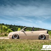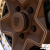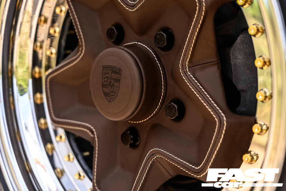 7.5x16in (front) and 8.5x16in (rear) custom Porsche cookie cutter split-rims – one side painted brown, one side trimmed in leather, original Porsche centre caps painted/trimmed to match with laser-etched Porsche crests, Air Lift suspension with 3P management, rear beam relocation plates (to centralise wheels when aired out), new OE calipers and discs all round, chassis notch for driveshaft, front balljoint extenders (to allow car to sit lower), custom power-steering lines and bottle
