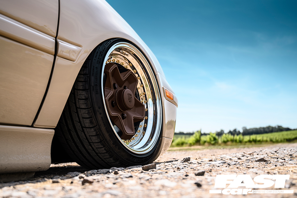 While all this was going on, he’d been putting a lot of thought into wheels; Max knew he wanted something custom and deep-dished, and ultimately landed on the idea of Porsche cookie cutters. These were reimagined as 16-inch three-piece splits, with the arches reprofiled to house their broad and staggered girth. “DR Services helped with widening the rear arches,” he explains. “No cutting of the outer arch skin took place, they were panel-beaten out to be at least 1.5-inch wider than factory while keeping the original look – meaning most people probably wouldn’t even notice this has been done! The inner arch was also cut and reshaped to allow for clearance of the tyre in the arch when aired out.