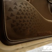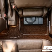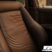 Dash centre modified to fit Kenwood doubleDIN wireless CarPlay headunit – heater controls and all switches moved to allow for larger unit, 12v socket relocated to glovebox, dash trimmed to owner’s design, dash speaker grilles trimmed with Kenwood speakers pattern (designed by owner), lower glovebox trimmed inside and out, fusebox lid trimmed with laser-engraved fuse list, BBS steering wheel retrimmed with custom hand-stitch style, all interior plastics (apart from dash driver zone) painted to match leather, centre console retrimmed including wireless phone charger, all stitching flowing into dash as one loop to highlight driver zone, front windscreen surround and sun visors trimmed, front and rear doorcards trimmed with owner’s custom-designed Kenwood speaker covers perforated and embroidered, front door pockets with leather inserts (for softer touch), window switches relocated from doors to centre console, speaker grilles modified with leather covers, full custom carpet set in brown twin-loop, retrimmed matching leather hoodbag, front and rear Recaro Colour Concept seats retrimmed with seat centres CNC machined perforated, stitched and embroidered by d:class automotive