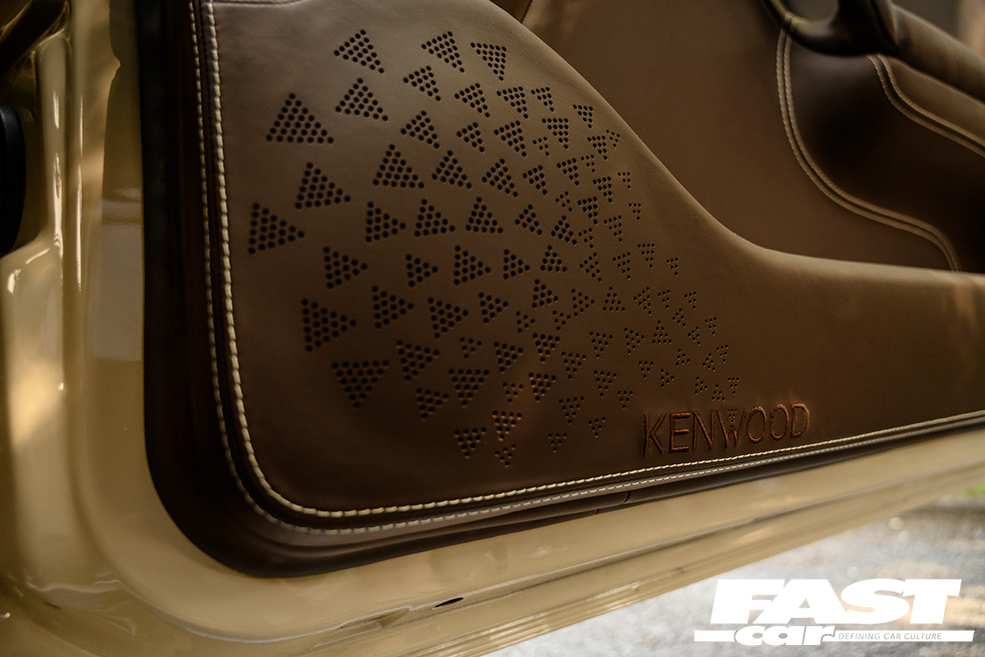 “Aside from the stitching, I used a CNC machine – courtesy of d:class – to perforate the speaker grilles on the doorcards and rear quarters,” he goes on. “The pattern consists of a range of varying-sized triangles, inspired by the Kenwood logo, which expand toward the speaker itself. The CNC machine also produced the centres of the seats; this was a hard part to design, as I needed to ensure that it remained simple and fit in with the rest of the theme of the car, while also showing the capabilities of the machine. A lot of people may not notice that the perforation in the seat base fades from front to back, and also has a body-colour beige within the holes. The embroidery in the seats is perhaps not so subtle, but is an ode to all the companies that have helped me along the way.”
