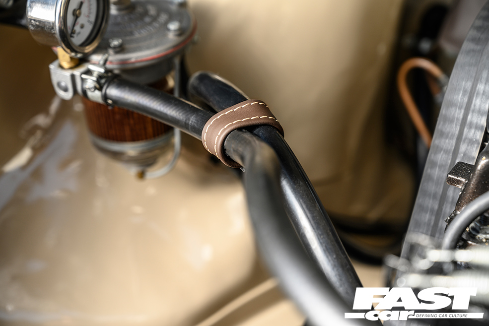 The doorcards were then extensively modified, carpets replaced in a more old-school style, and then a thorough design laid out for the retrim: Max wanted all of the stitching to flow from one panel to the next, a cohesive aesthetic with each piece drawing the eye to the next. Brown leather was chosen, with contrasting cream twin-stitch to tie the interior and exterior colours together. It’s extremely cleverly done, with the stitching visually isolating the driver zone from the passengers, while the side sills run alongside to tie in the B-pillar and rollbar, finishing in the rear quarters and over the rear seat. The details are mind-blowing too – the fusebox cover has even been lasered with the original fuse order. The attention to detail is staggering.