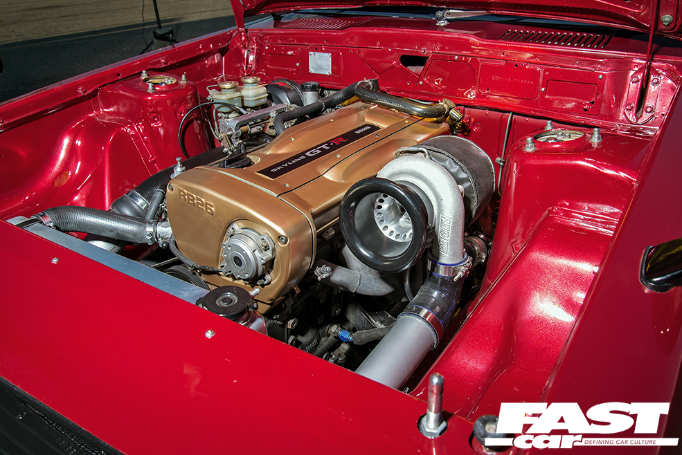 2.6-litre RB26DETT turbocharged straight six (from R33 Skyline GT-R), rear sump conversion, Precision 6262 ceramic ball-bearing turbocharger, Hybrid Performance turbo manifold, Precision 46mm wastegate, 50mm TiAL blow-off valve, 850cc fuel injectors, AEM 320lph fuel pump, custom intercooler, GReddy boost controller, NGK iridium spark plugs, Griffin dual-pass radiator, SPAL fan, NISMO fuel pressure regulator, Microtec LT-16c ECU, RB25DET six-speed manual gearbox, OS Giken dual-plate clutch, Wilwood clutch master cylinder, R200 limited-slip differential (from Z31 300ZX)