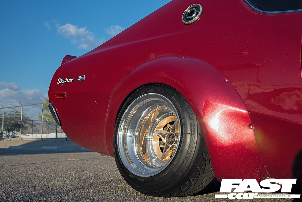 It wasn’t long before the holy grail of Nissan drivetrains made its way towards Pat through the SoCal grapevine: a tuned RB26DETT from an Nissan R33 GT-R, complete with a two-wheel-drive gearbox from the RB25. “It was really a case of cutting out all the existing motor and trans mounts, slicing open the transmission tunnel and firewall, dropping in the drivetrain and then fabricating everything to make it work… simple as that.” Pat then modestly explains how dumping this huge hunk of engine perfection into his humble Kenmeri Skyline came about, citing the then-patchy bodywork as a help rather than a hindrance. We expect tweaking with US fighter jets on a daily basis had something to do with his nonchalance towards this job!