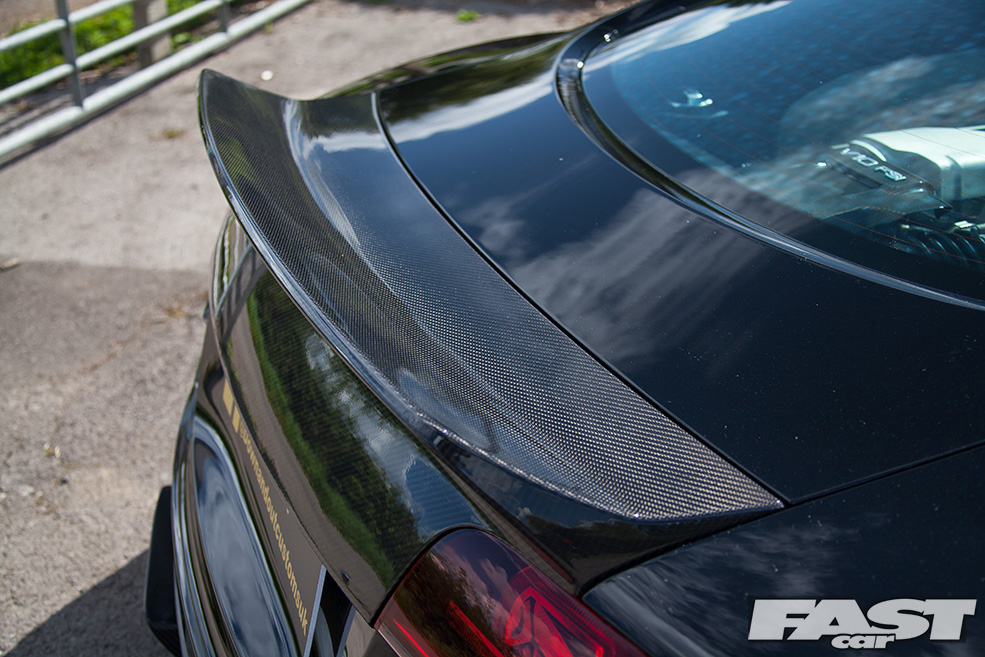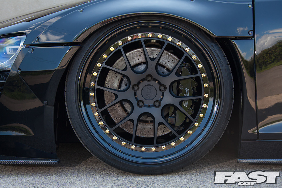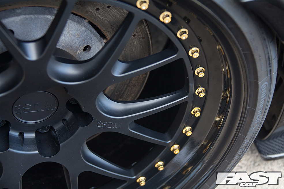Clearly, a project of this calibre required some extra special rims, and Chris knew just who to turn to. “3SDM created a custom set of forged, 3.01 wheels just for this car,” he says. Not surprisingly, they fi t to perfection, although getting some rubber to stretch over the gargantuan 12.5×20-inch rears was tough. “We needed 325/25x20s, which limited our choice somewhat, but fortunately we found some Continentals, which are bang on.”