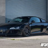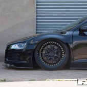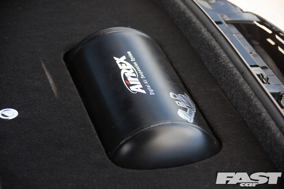 Pop the bonnet and you’ll find a neat air tank in the custom enclosure, which was designed specifically to slot into the R8’s narrow luggage compartment. The air system can be controlled by smartphone, allowing the R8 to be dropped over its wheels at will.