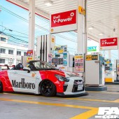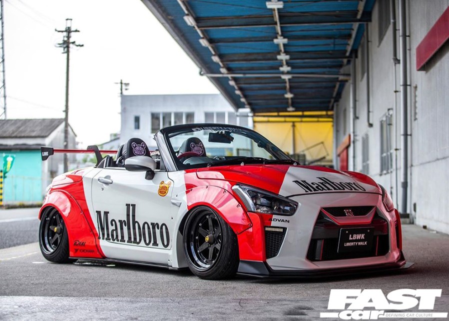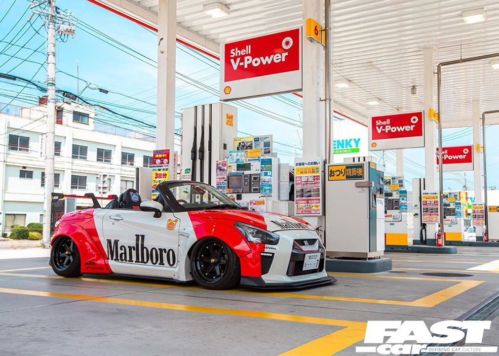 Like a four-foot bouncer, or a terrier with a toothache. But now Kato-san’s band of merry pranksters have taken things a step further, stirring a baby GT-R-style facelift into the mix, before covering it all in Marlboro livery like a 1970s race car.