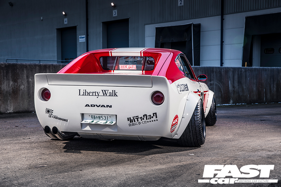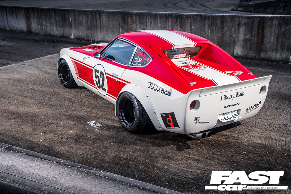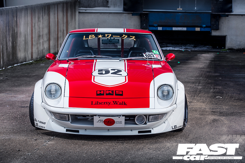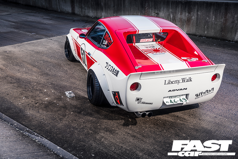 Kato-san is an irrepressible innovator, there’s no denying that. He’s the kind of man who’ll buy a Ferrari F40, then buy another one so that he can modify it; nothing is taboo in the world of Liberty Walk – if it’s cool, it’s cool, and no car is untouchable because they’re just things after all. And this unerring and ineffable passion is fed by the performance cars and racers of the 1970s, the cars that first sparked his passion for modding and tuning. The Datsun S30 is the ideal canvas for this sort of treatment too – sold as the Fairlady Z in Japan and the 240Z elsewhere (then the 260/280Z when larger engines were added), it’s essentially the Japanese E-Type, with race heritage in spades, an integral thread in the tapestry of Japan’s automotive heritage.