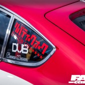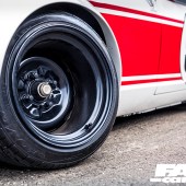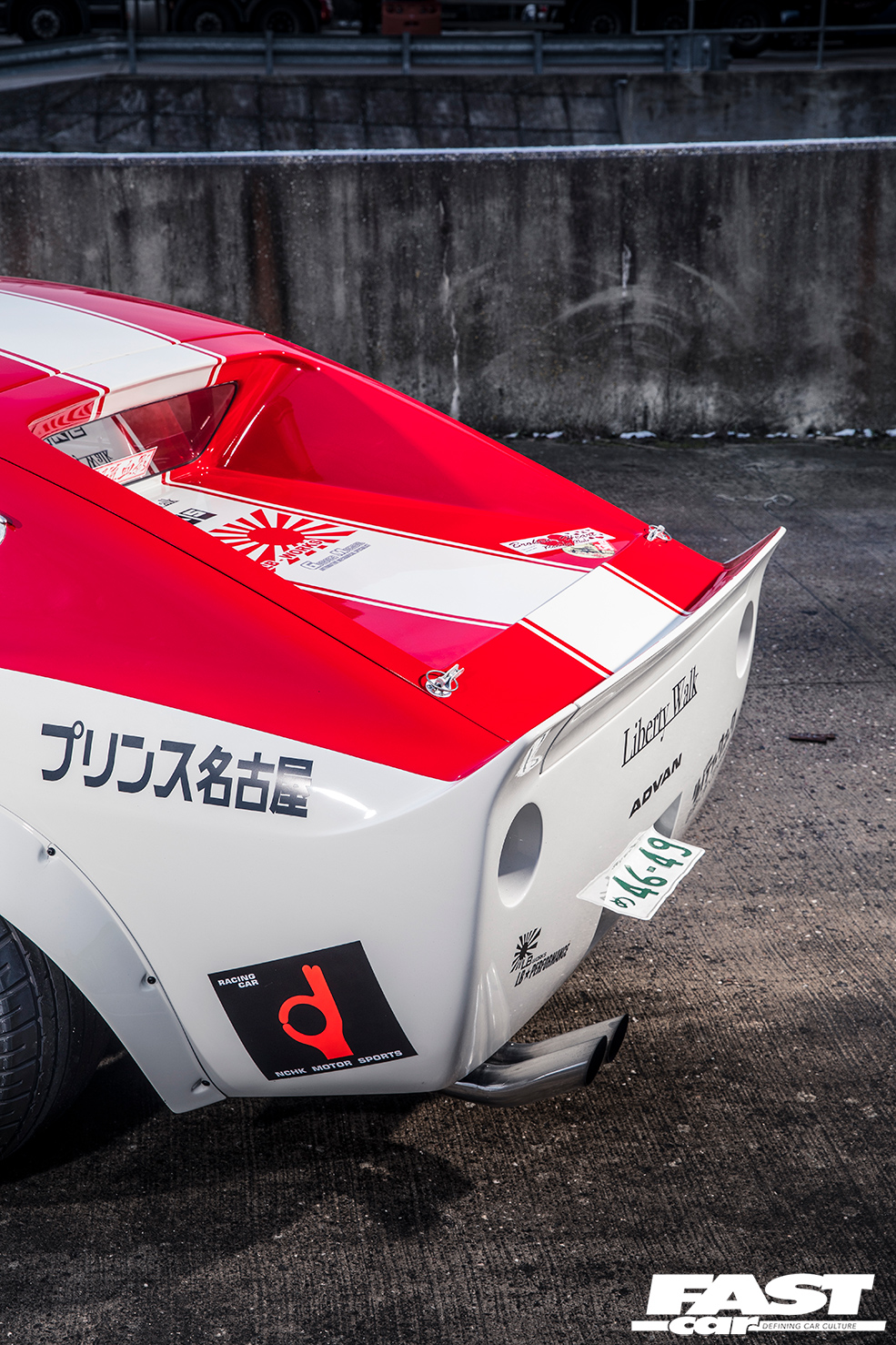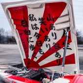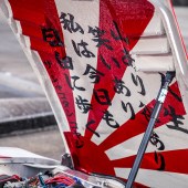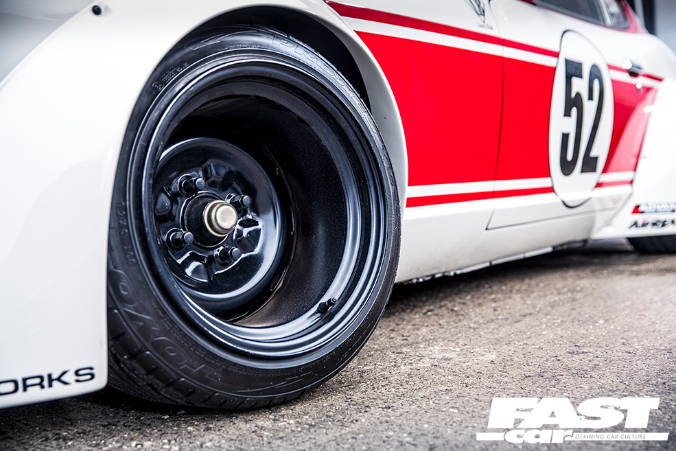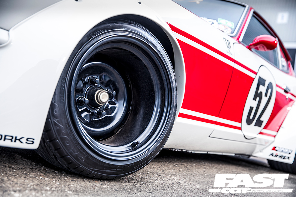 Fast-forward a few years, however, and Kato-san fancied a change. He’s an innovator, and never happy to rest on his laurels, it’s always important to keep pushing forward. As the Liberty Walk brand grew, so did his personal car collection, and this shakotan Fairlady, the jewel in the crown, was ripe for a makeover. Something that would make a lateral move from down-the-line shakotan to a fusion of Works/kyusha sensibilities and the kaido racer style – niche touchpoints within the Japanese retro modifying scene, blending into the old-school road-and-race look you see here. The panscraping static stance was swapped for a custom air-ride setup simply because the Fairlady was destined for a world tour and it wouldn’t get in the container on those wound-down coils, and the multi-spoke alloys were replaced by a set of hallucinogenically broad steel wheels with super-aggressive offsets, packing out those widened bolt-ons with nanometric precision. (The rear tyres are particularly noteworthy – it’s notoriously tricky to find fat race tyres for 14”-diameter wheels, so Liberty Walk now produce their own in 245/525-14 sizes.)