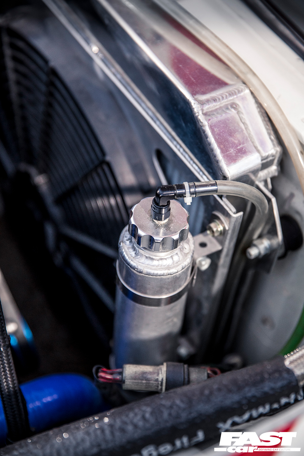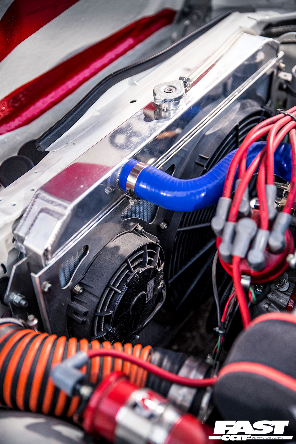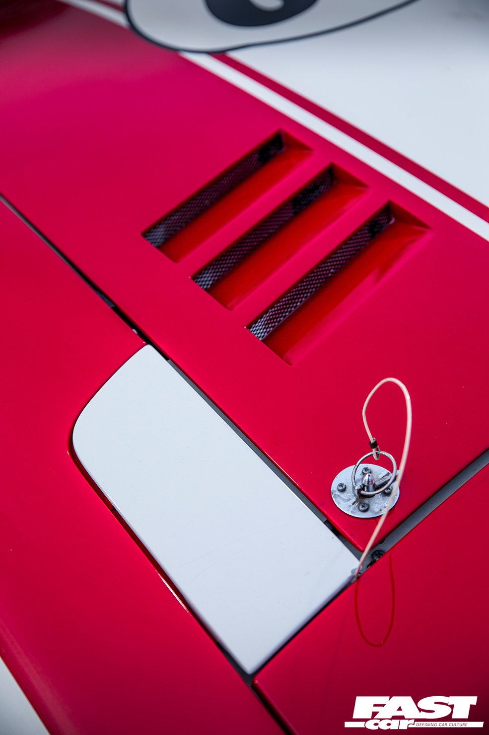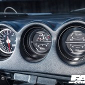 The interior is a real treat for fans of classic race cars, with a pair of gloriously vintage PRE bucket seats stretching subtly crinkled leather around those eyelets that evoke the Ford GT40 or Lamborghini Miura, with bright yellow shells to contrast with the red rollcage. The Fairlady has one of the all-time classic dashboards, its curves making it look as if the gauges are bursting through from within, and Kato-san’s augmented this with a whacking great Pro-Comp rev counter. Why? Because his L28 engine is no ordinary L28 engine…