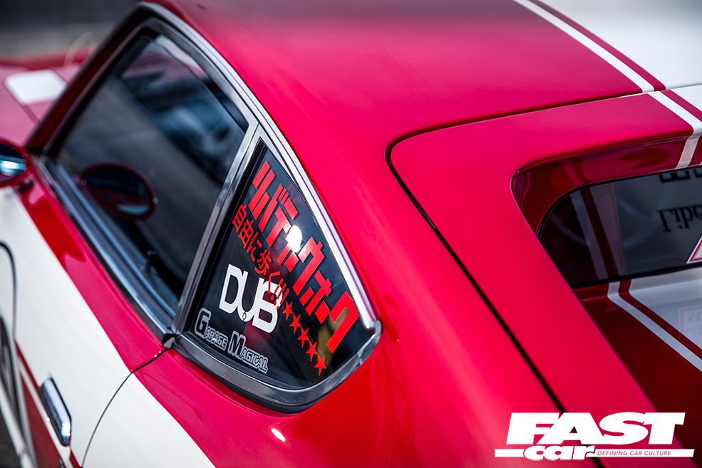 The final aesthetic flourish in the makeover, after converting the custom smoothed rear panel from twin- to single-taillights, was to rework it in a fresh new livery. In the true spirit of the kaido racer, Kato-san opted to formulate a sympathetic evolution of the livery used on the classic Prince R380 race cars: slippery coupes on Brabham chassis with Skyline engines, with sloping noses and rear buttresses that are neatly echoed in Kato-san’s Datsun vision. This is masterfully blended with the stripes from Kunimitsu Takahashi’s KPGC10 Skyline GT-R race car – just one of an endless stream of references for the classic Japanese race aficionado to drink in with a knowing nod.