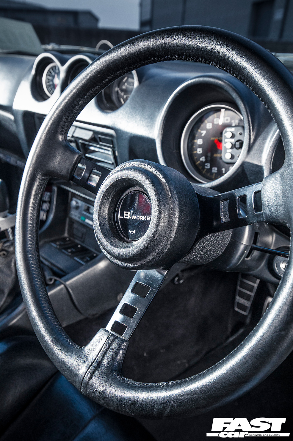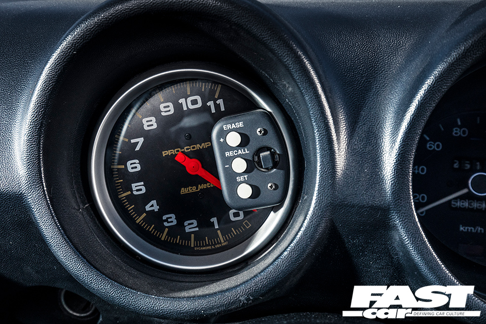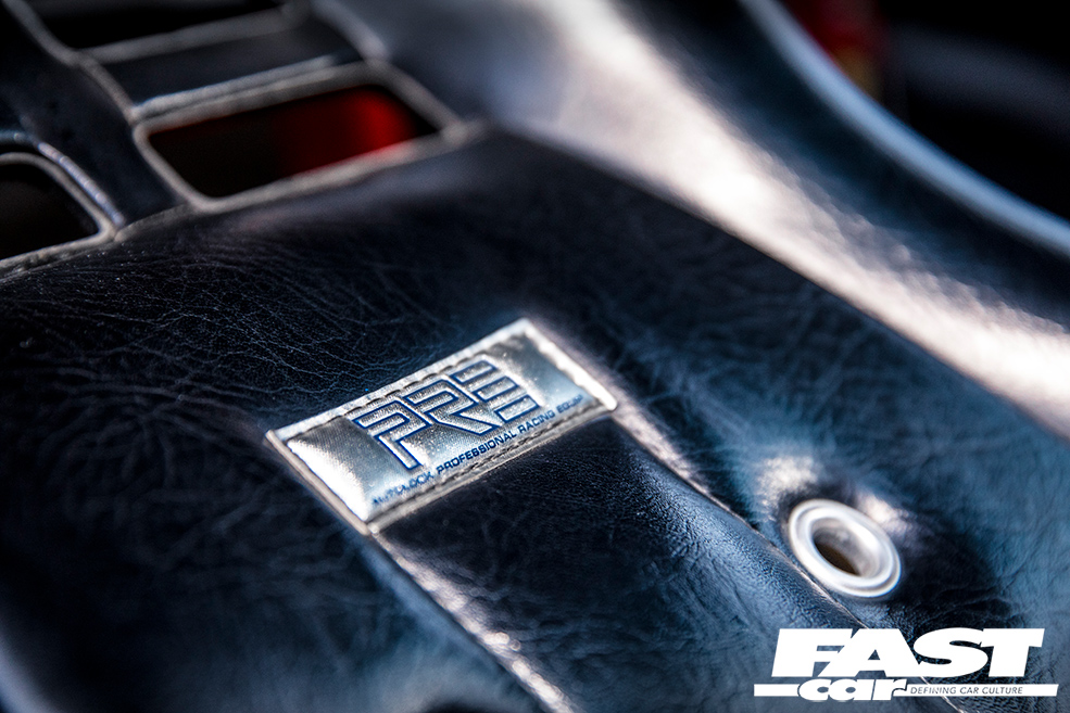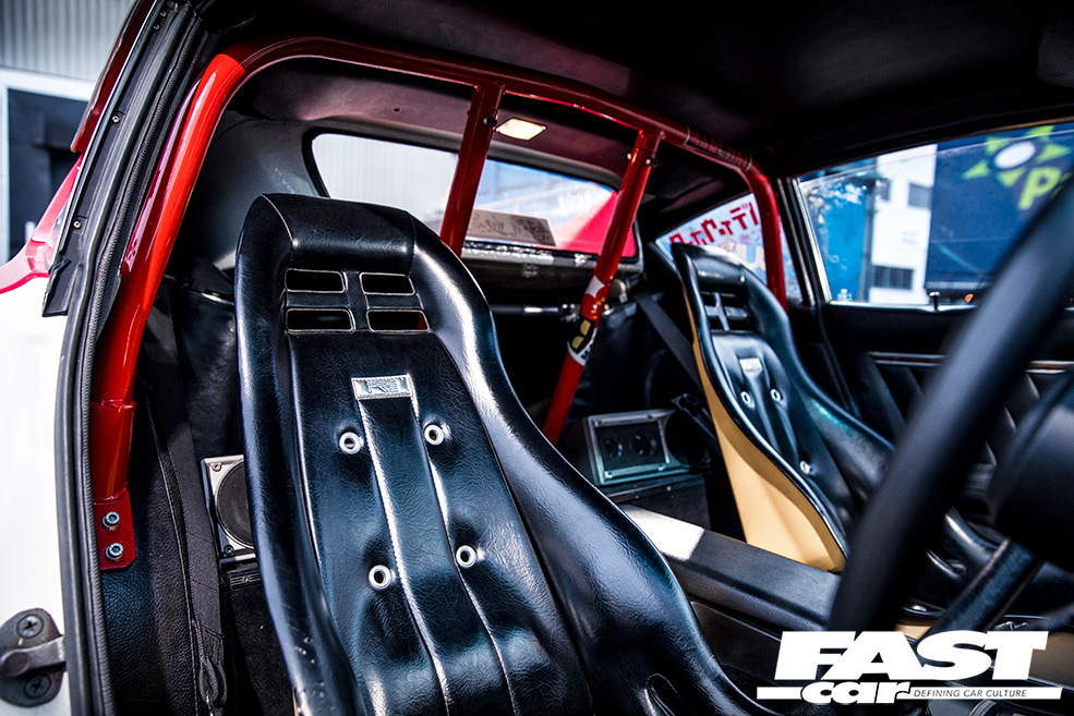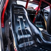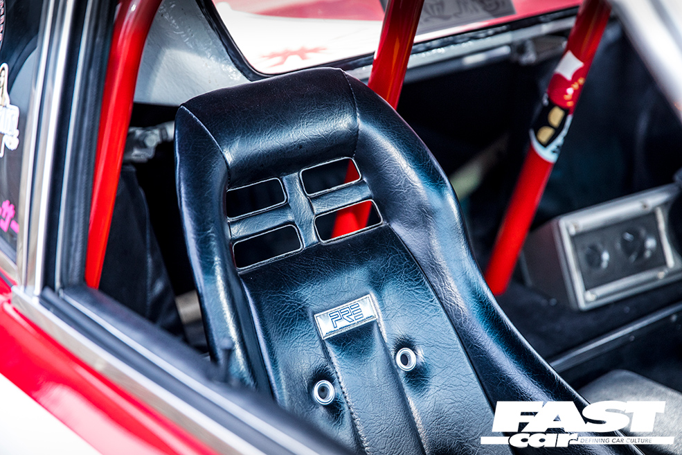 Classic PRE bucket seats, colour-coded rollcage, deep-dish steering wheel with LB Works centre, line-lock control on gearstick, Auto Meter Pro-Comp rev counter, vintage Pioneer audio