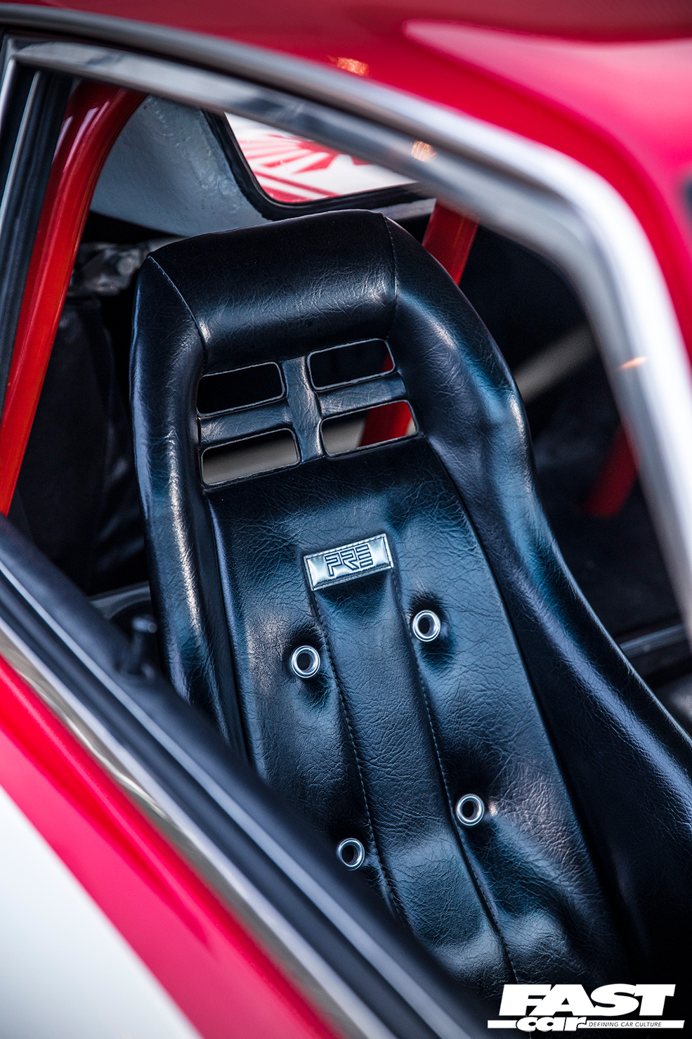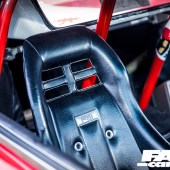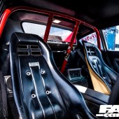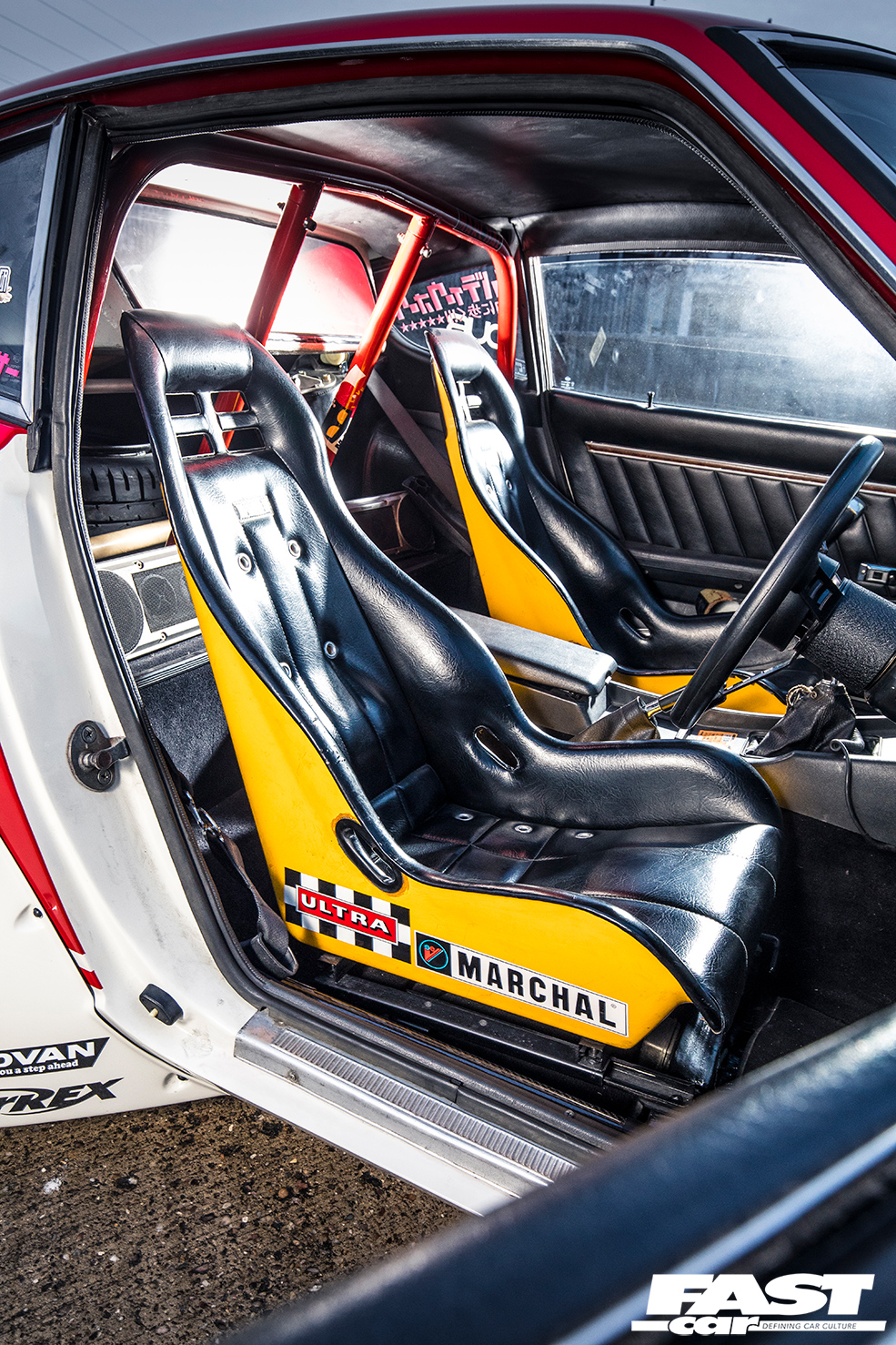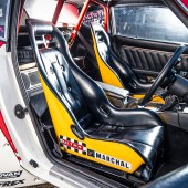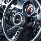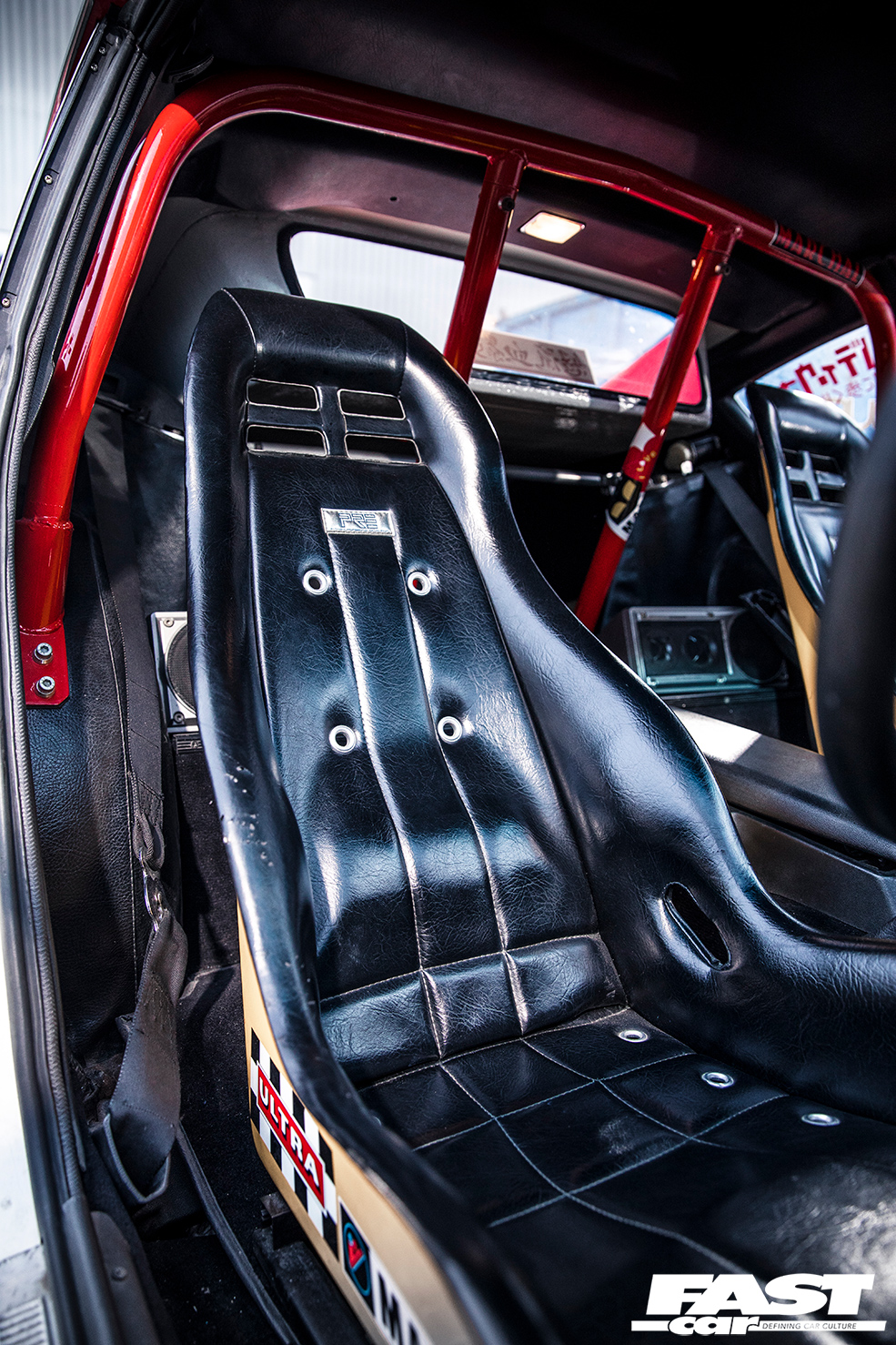 Classic PRE bucket seats, colour-coded rollcage, deep-dish steering wheel with LB Works centre, line-lock control on gearstick, Auto Meter Pro-Comp rev counter, vintage Pioneer audio