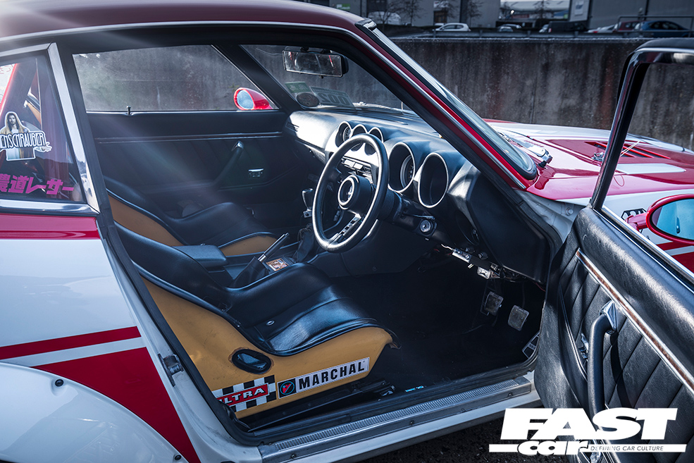 The initial inspiration here stems from the Fairlady ZG. This was a domestic model released in 1971 to homologate the car for Group 4 racing – it had a longer fibreglass nosecone, the so-called ‘G-nose’, along with wider Works bolt-on arches and a rear spoiler. It’s the ZG look that Kato-san has ingeniously reworked here, and you may already be aware of this car’s earlier two-tone grey guise, images of which flooded the internet seven or eight years ago. It was smooth, lean, taut and muscular, looking like a cross between a US custom and something from a Manga cartoon. It sat static over SSR Jilba Racing wheels, and it reframed what a lot of people thought about the concept of modifying classic cars.