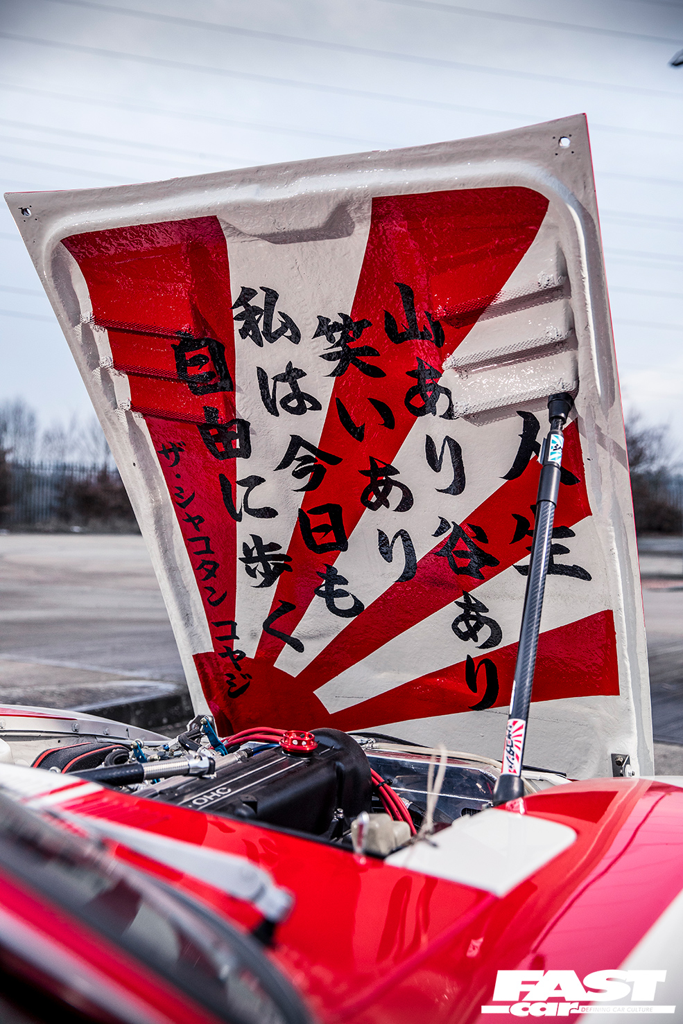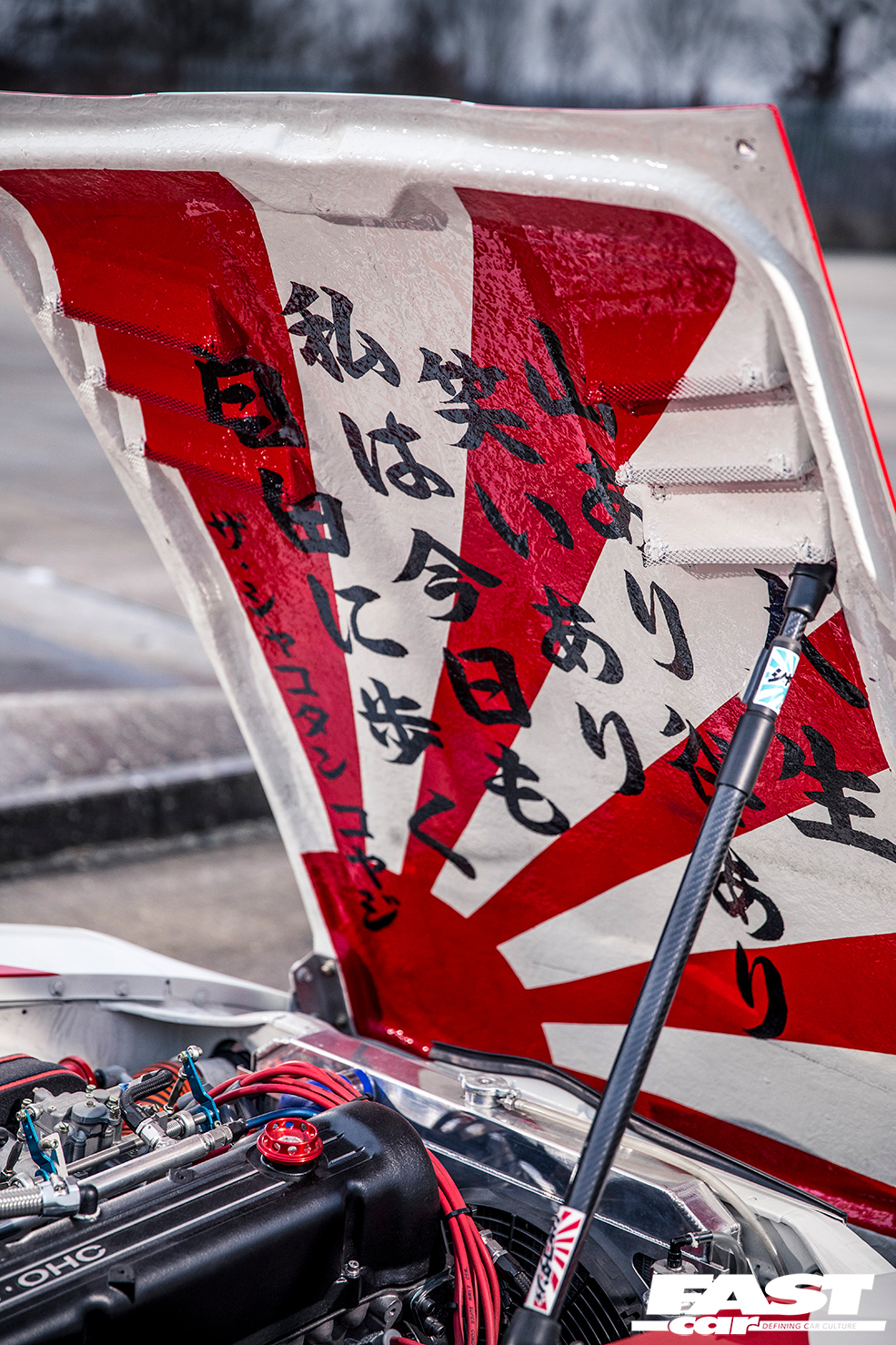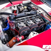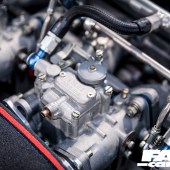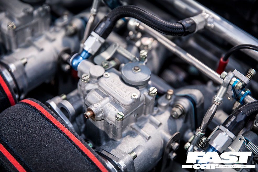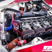 It’s very much the Liberty Walk way to fuse eye-catching looks with devastating performance, and this wouldn’t be much of a kaido racer without a bit of race-car power. So the 2.8-litre straight-six was handed over to Garage Okazaki to rebuild it as something a bit more frantic and urgent. Their endeavours included putting in a lot of head work before boring and stroking the block to a smidge over 3.0-litres, with high-comp pistons, conrods and crank from KEW along with their own proprietary cams. The result of all this, as the hungry motor slurps through its triple Solex twin-choke carbs, is a motor that revs to over 8,000rpm and makes a noise like Satan’s dog gargling with wasps, spitting its spent gases through those upswept twins with a characterful rasp.