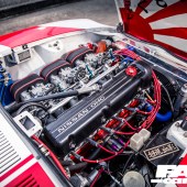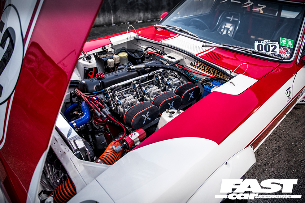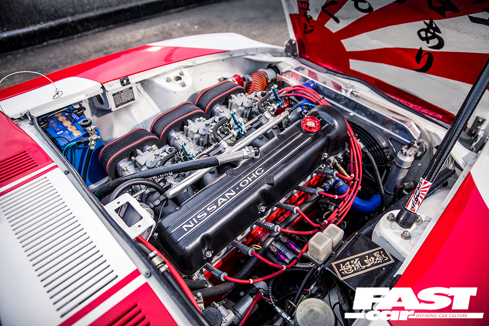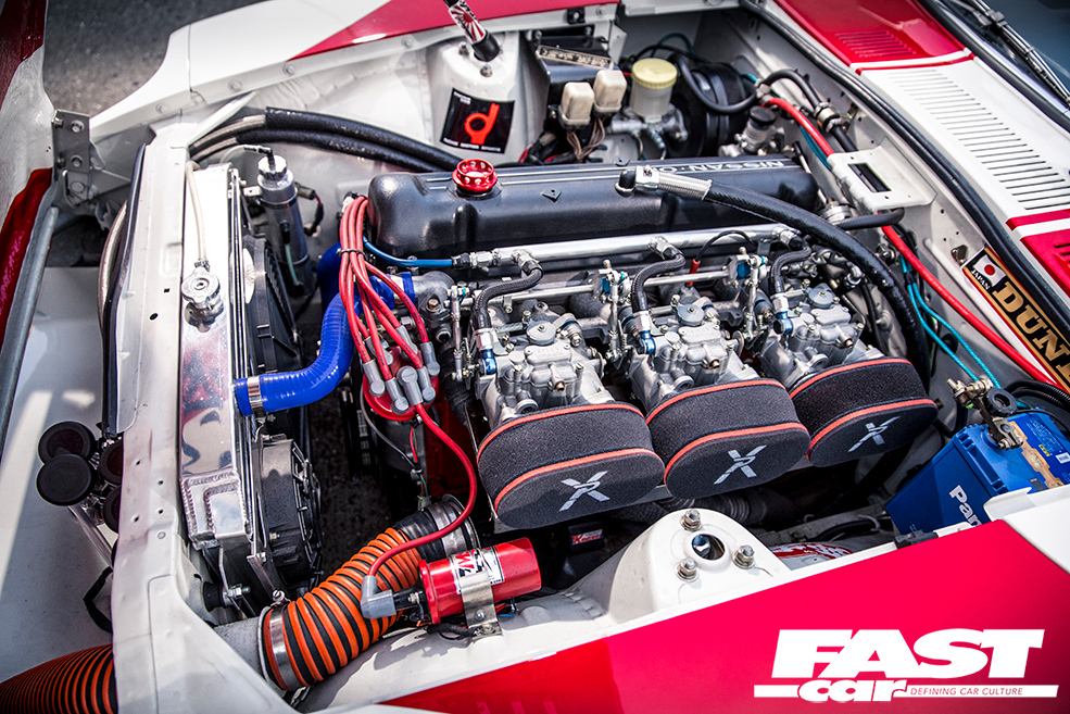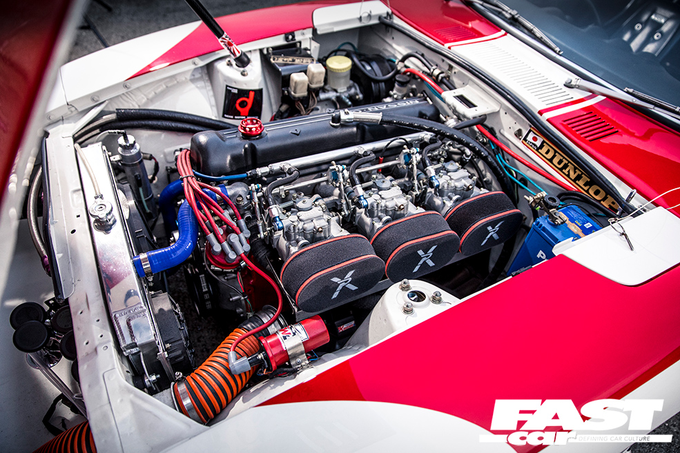 L28 2.8-litre straight-six – bored and stroked to over 3.0-litres, triple Solex twin-choke carbs with Pipercross filters, ported and polished head with bigger valves in recut seats, KEW high-compression pistons and conrods, KEW crankshaft, Garage Okazaki cam, aluminium radiator, MSD ignition, custom straight-through exhaust system with twin upswept tails
