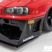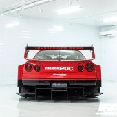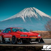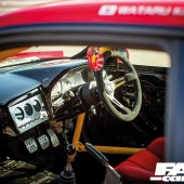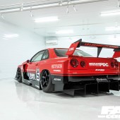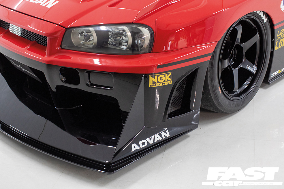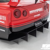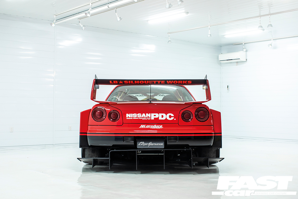 Now, you’ll notice that we’re talking about an ER34 Skyline here rather than an R34; without getting too bogged down in the minutiae of model codes, the baseline here is that he didn’t want to cut up an R34 GT-R for this project. And while many people may assume that ‘ER34’ automatically means ‘four-door’, that’s not always the case: in this instance, we’re talking about a two-door GT-T – the model that encapsulated much of the spirit of the GT-R, but toned down slightly with a single-turbo RB25 and a RWD layout. The body transformation really is quite remarkable too – much like the KDR30 had to look a bit like the R30s in the showrooms, so Kato-san’s fresh creation is still recognisably an R34-gen model… it’s just several orders of magnitude more insane. The colossal box arches house 11×18-inch Yokohama Advan Racing GT wheels on Advan slicks, with custom hub extenders to get them sitting out even further. The front spoiler is frankly ludicrous; obviously there would be no way to register this car for the road in Japan anyway, but if there was one sole element that’d kibosh the idea it’s this aggressive ankle-slicer. Even more deranged stuff is happening round the back – those squared off arch extensions are joined by a towering spoiler, and the bulk of the view is dominated by an enormous custom diffuser. The Group 5 DNA is strong with this one, it’s dripping retro race menace from every pore. And of course it’s all been slathered in that iconic Tomica red-and-black livery, here sneakily updated to replace the principal sponsor logos with Liberty Walk’s own.