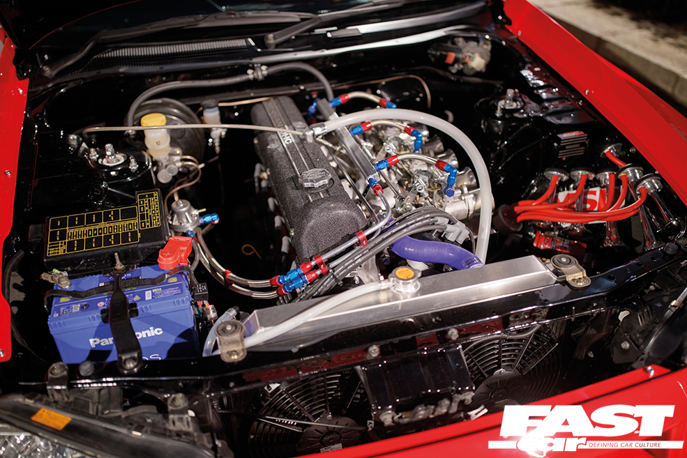 2.8-litre L28 straight-six – stroked to 3.1-litres, ported and polished head, high-lift cams, triple twin-choke 50mm Solex carbs, stock exhaust manifold into custom unsilenced side-exit system