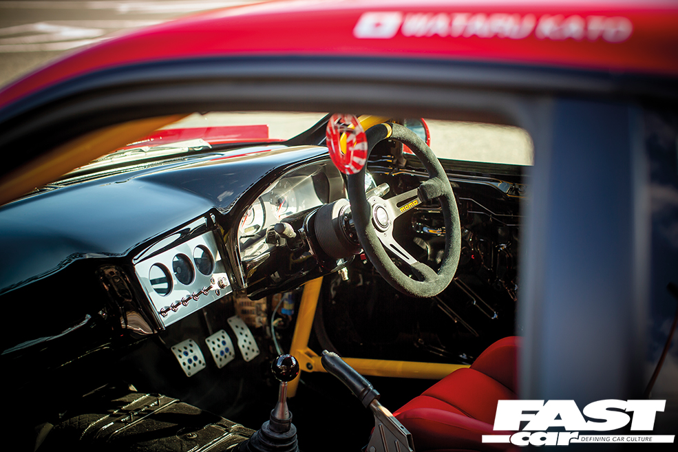 There are myriad nods to the underground tuning scene, as you’d hope from a man so deeply entrenched within it for so many years. The Vitaloni wing mirrors are a cheeky addition, something you’d more usually find on full-bore bosozoku builds (or, indeed, Lamborghini Miuras), and the boso theme continues with the addition of a set of tuneful air horns. They play the Mickey Mouse theme, because screw convention, and screw anybody who questions it. All of which adds to the car’s mystique: it’s half tuner special, half race car. Look inside and you’ll find that it’s been fully stripped and painted gloss black, the eerie inky void treated to a splash of colour thanks to the lipstick-red Bride seats and citrus-hued Cusco rollcage. And when Kato-san flicks the switch and the suspension airs out, there’s a beautiful juxtaposition between the killer stance as the body kisses the asphalt, and the out-and-out racer details – the aero fins that run along the top of the wings, the extravagantly vented bonnet, that almighty rear spoiler, it’s all such a riot of detail.