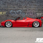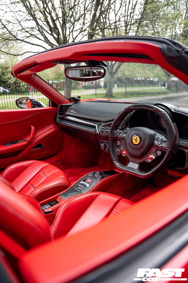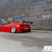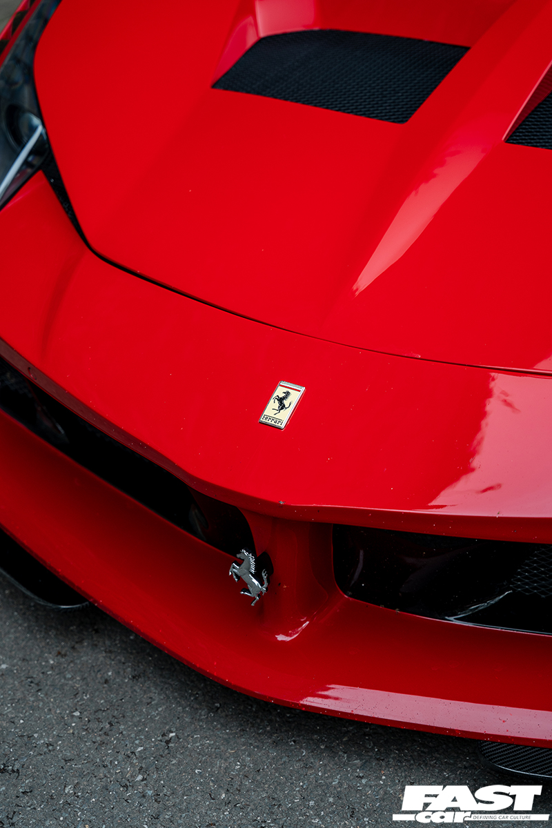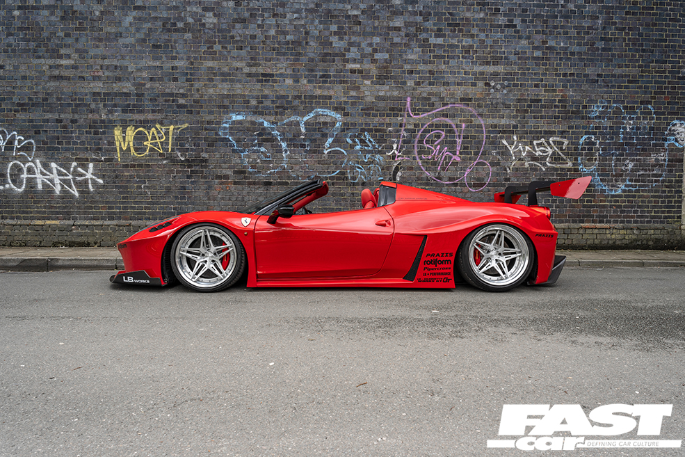 Now, it’s worth pointing out that Chris isn’t exactly a novice at this; indeed, his past and present car affliction requires some unpicking, so take a deep breath as we breeze through it all: prior to this Ferrari, he’d owned a TVR Tuscan Speed Six, a couple of twin-turbo Mk4 Supras, an R35 GT-R, a Clio with a GT Turbo engine in it, an M3, a WRX STi, an Aston Martin DB9, plus a whole bunch of other cool stuff. And the bagged and kitted Ferrari isn’t the only exotic curio on the driveway today; no, it shares real estate with an Ariel Atom, a Lamborghini Aventador, a McLaren MP4-12C, plus a Range Rover Sport and a Supra TT6 – all comprehensively modified. Safe to say he’s a man of reasonable means who enjoys the odd fast car, then. And he’s not one to keep things stock either, as the vivid red vision before us demonstrates.