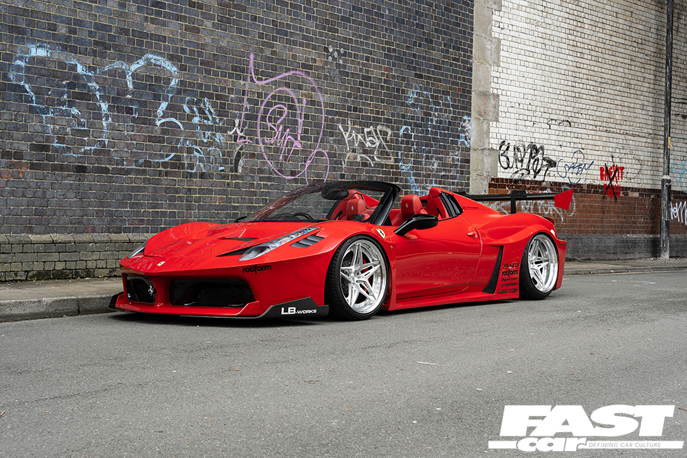 The contemporary modifying scene is rife with this sort of tension. Fashions move and shift and transmogrify, and while the noble pursuit is to mod your car to your own tastes and consider it a bonus if anyone else takes a liking to it, the reality is that culture’s evolved and that’s not the way the world works these days. In 2021, visual presence and social media success often sit on a level pegging with performance and handling, while it’s oh-so-important for your spec list to be bristling with all the right names. Who blinks first? Certainly not the brave. And with the Liberty Walk Ferrari 458 you see here, you’re witnessing a narrow escape from a Mexican standoff with a strong roll-call of fashion-forward names, coalescing into a mould-breaking build which opens the door for every other Ferrari to rush through. Such is life.