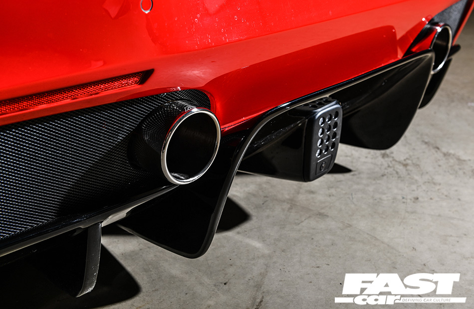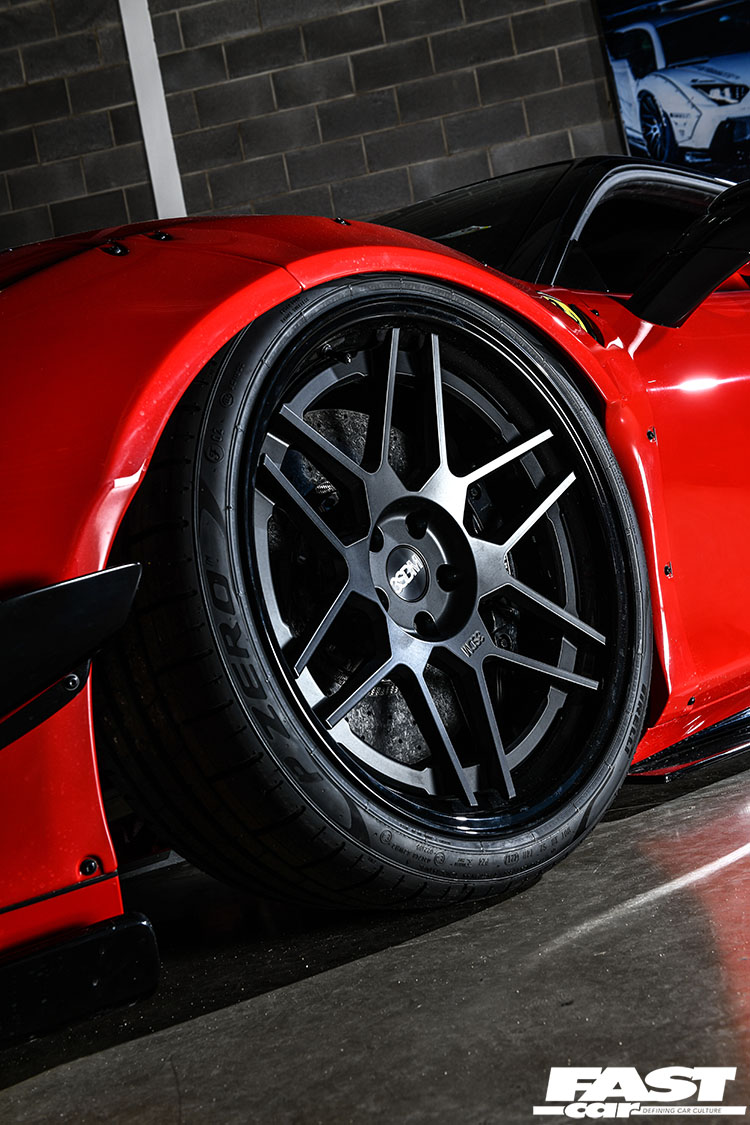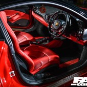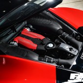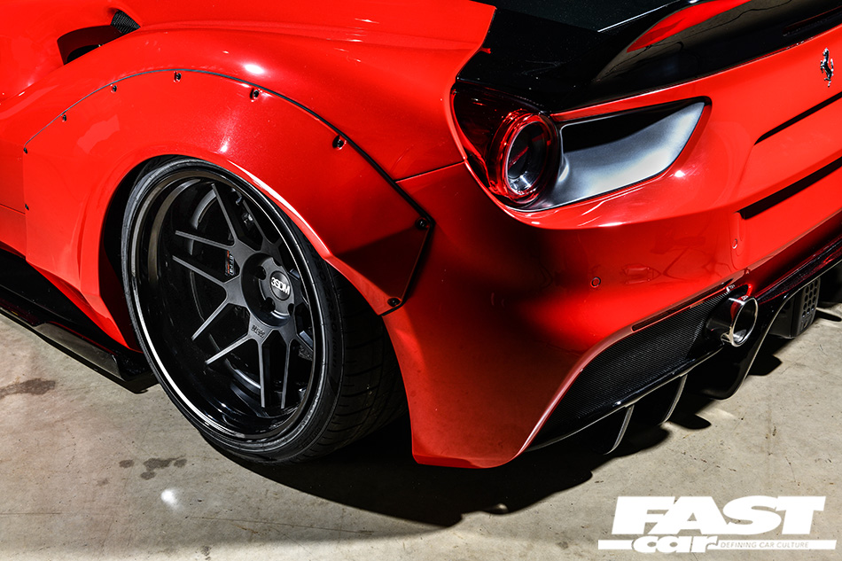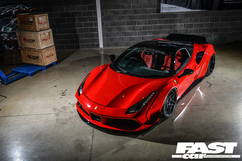 “It’s a 2016 model, which was sourced by Tom Hartley Cars with just 900 miles on the clock, and delivered direct to Liberty Walk Europe,” says James. “The build was fully completed by The Performance Company, with the bodywork and paint taken care of by Colourkraft – and, as yet, the owner hasn’t seen the car in person! But with constant discussions and photos being sent back and forth, we were able to build the 488 to his precise standards with full communication at all stages. The decision was made to match the Liberty Walk kit to the original Ferrari Rosso Corsa paint, with a number of contrasting accents finished in Beluga Black.”