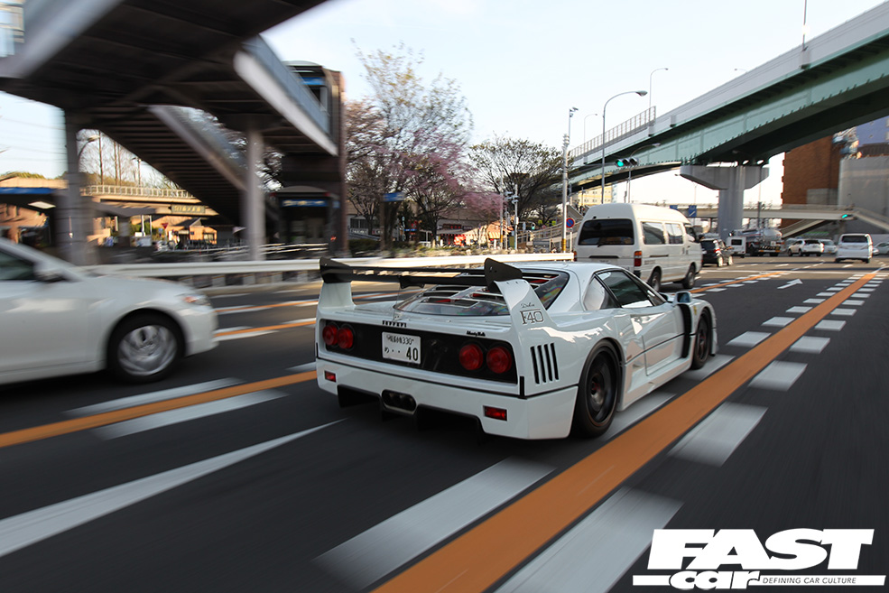 We don’t know what’s more impressive; that Kato-san actually owns two F40s, or that he has actually customized one to spice it up a little! The white example we were there to see wears a one-off exterior inspired by the ultra rare LM homologation versions of the F40. At the front the massive, one-piece Kevlar cowl has been stripped of the pop-up headlights that help give the F40 that low pointy nose and replaced with fixed HID projectors behind the clear cover section that houses the indicators and small lights. As Kato-san explains this has actually helped drop a significant amount of weight as the mechanism that operated the stock headlights was quite heavy.